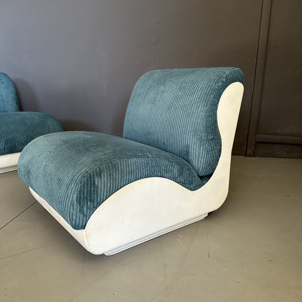 Set of Lounge Chairs with Fiberglass Structure in Blue Ribbed Fabric, 1970s
