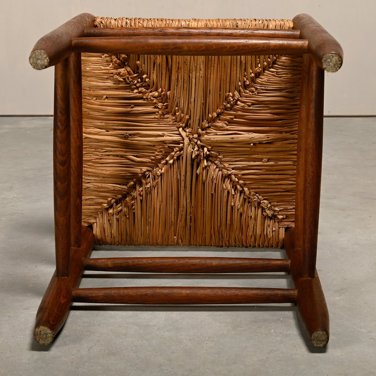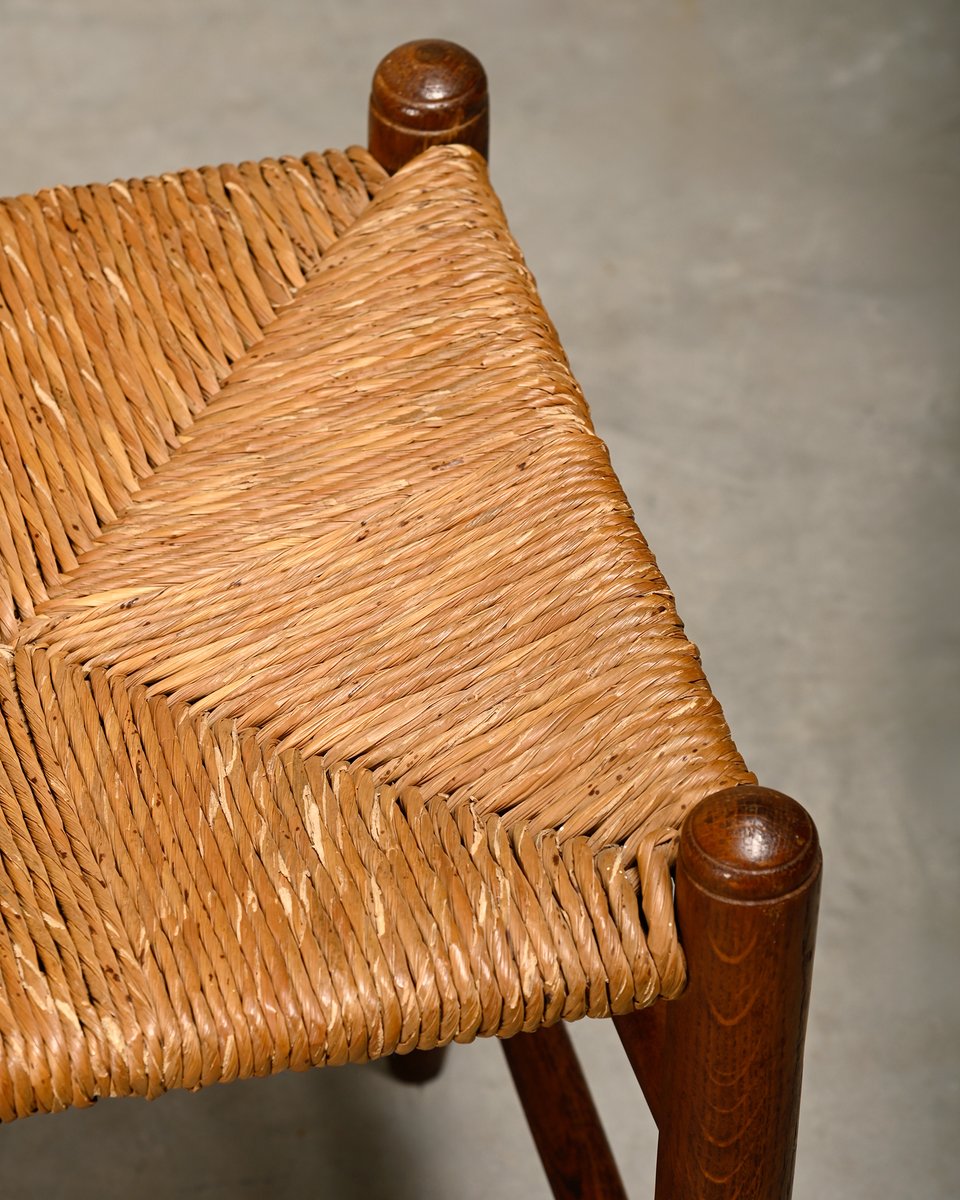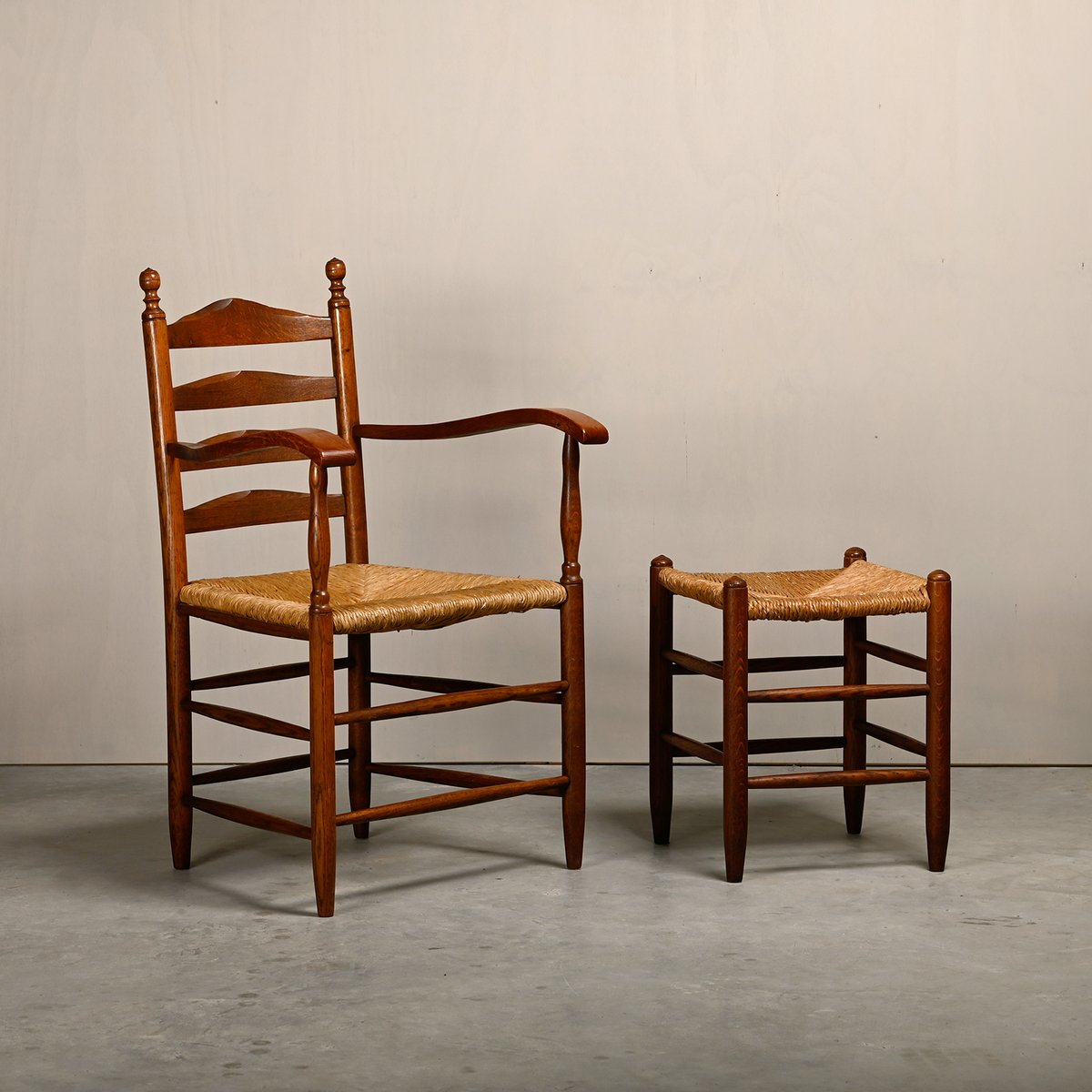 Set of Rustic Armchair and Stool in Stained Oak and Rush, 1950s