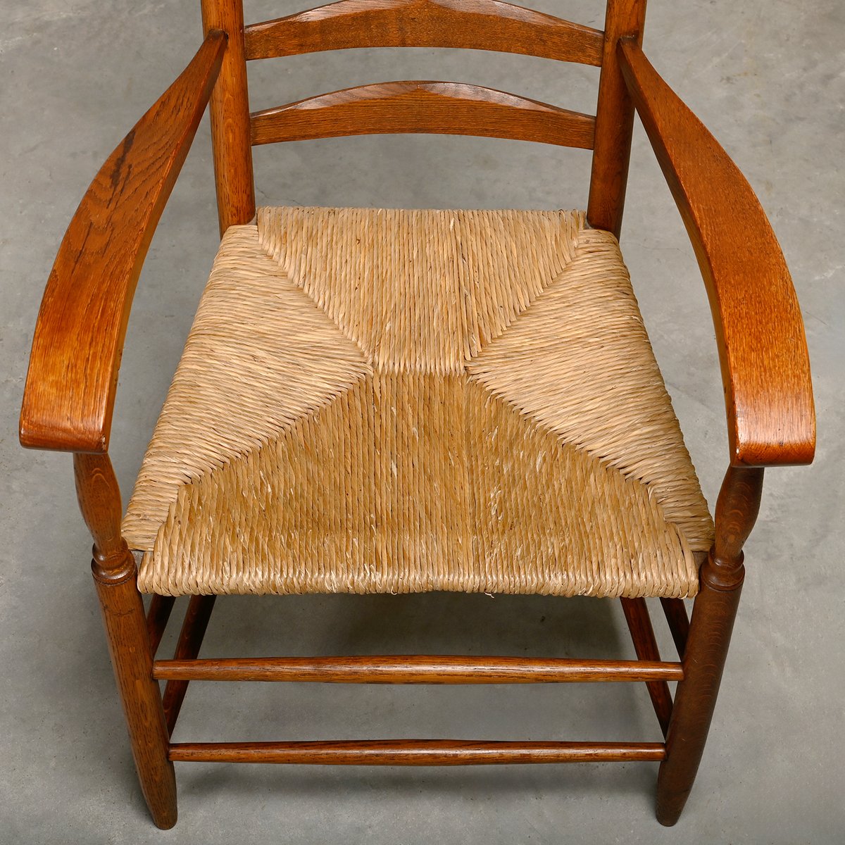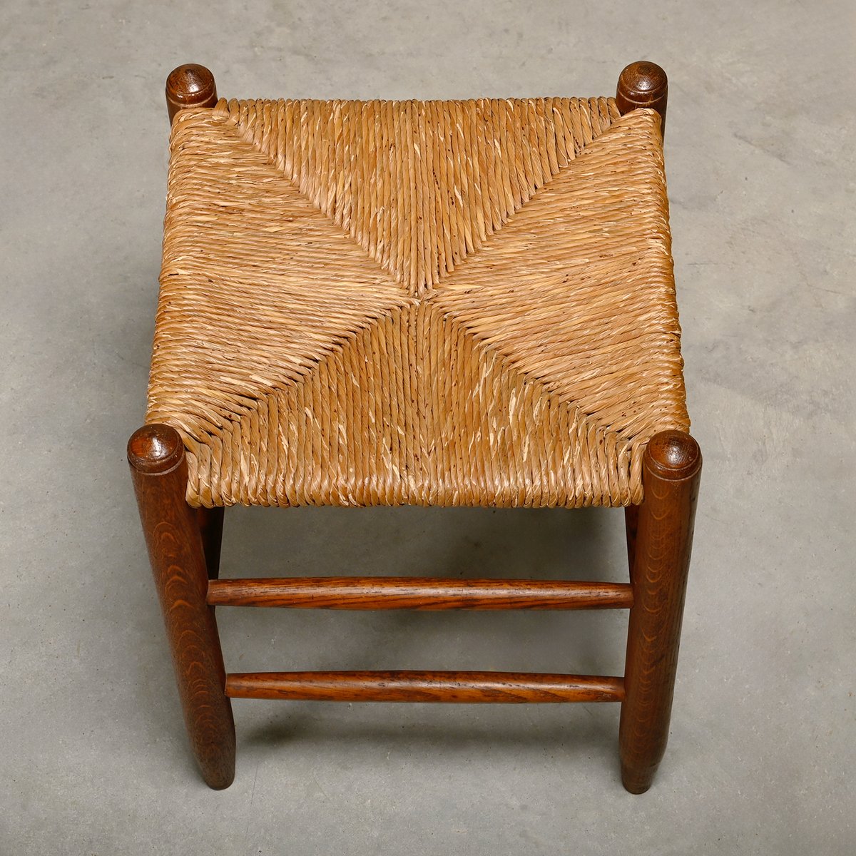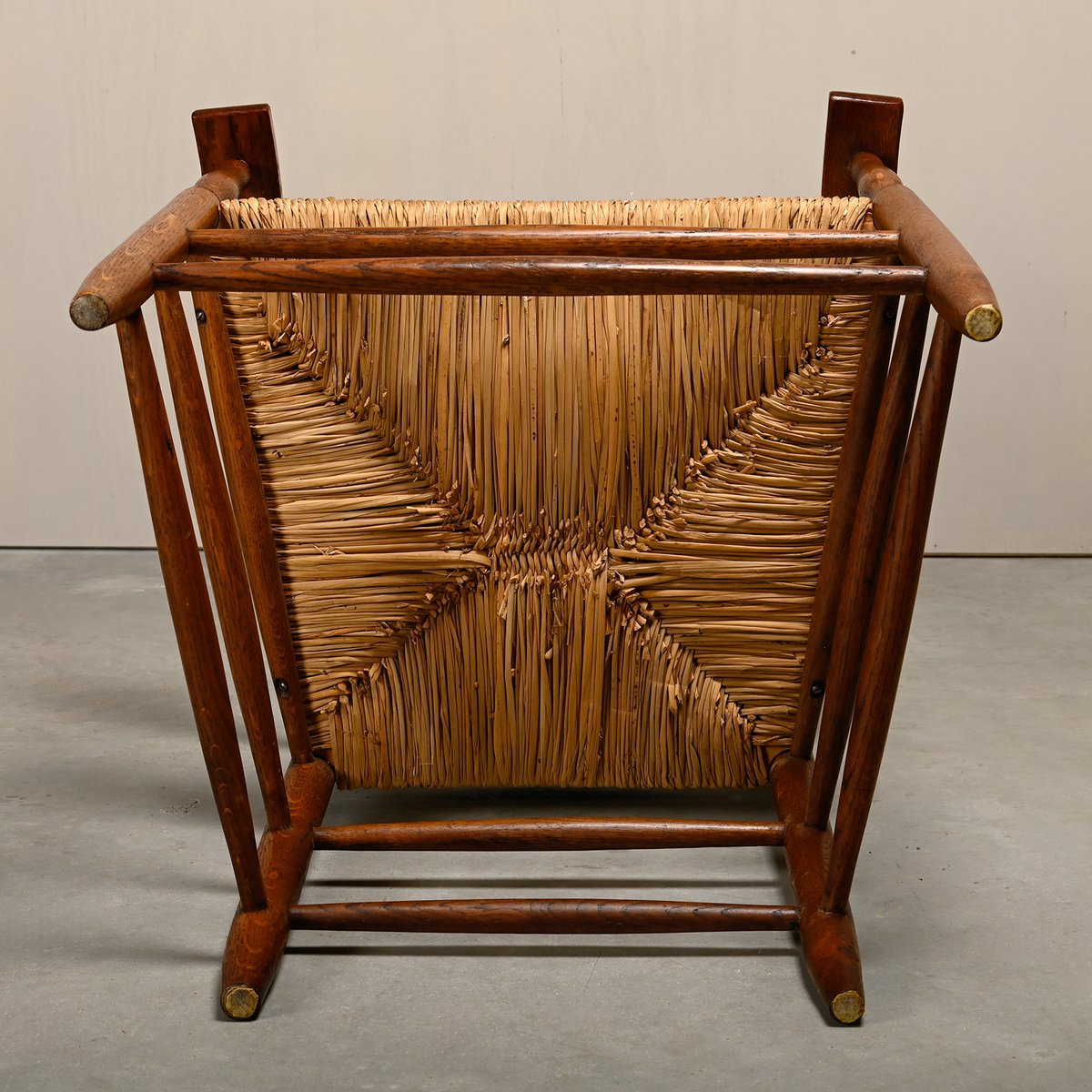 Set of Rustic Armchair and Stool in Stained Oak and Rush, 1950s