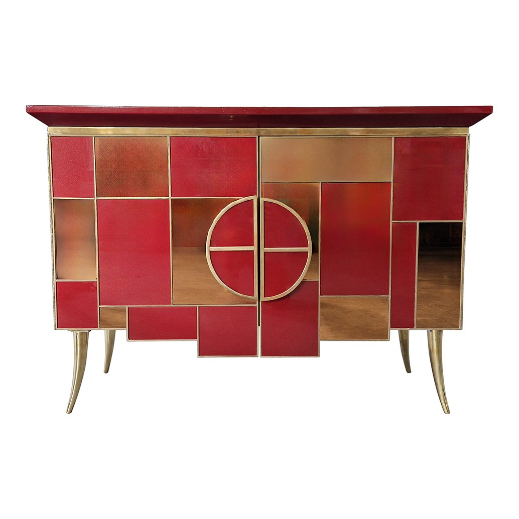 Sideboard with 2 Illuminated Doors in Burgundy Red Glass and Mirror, 1980s