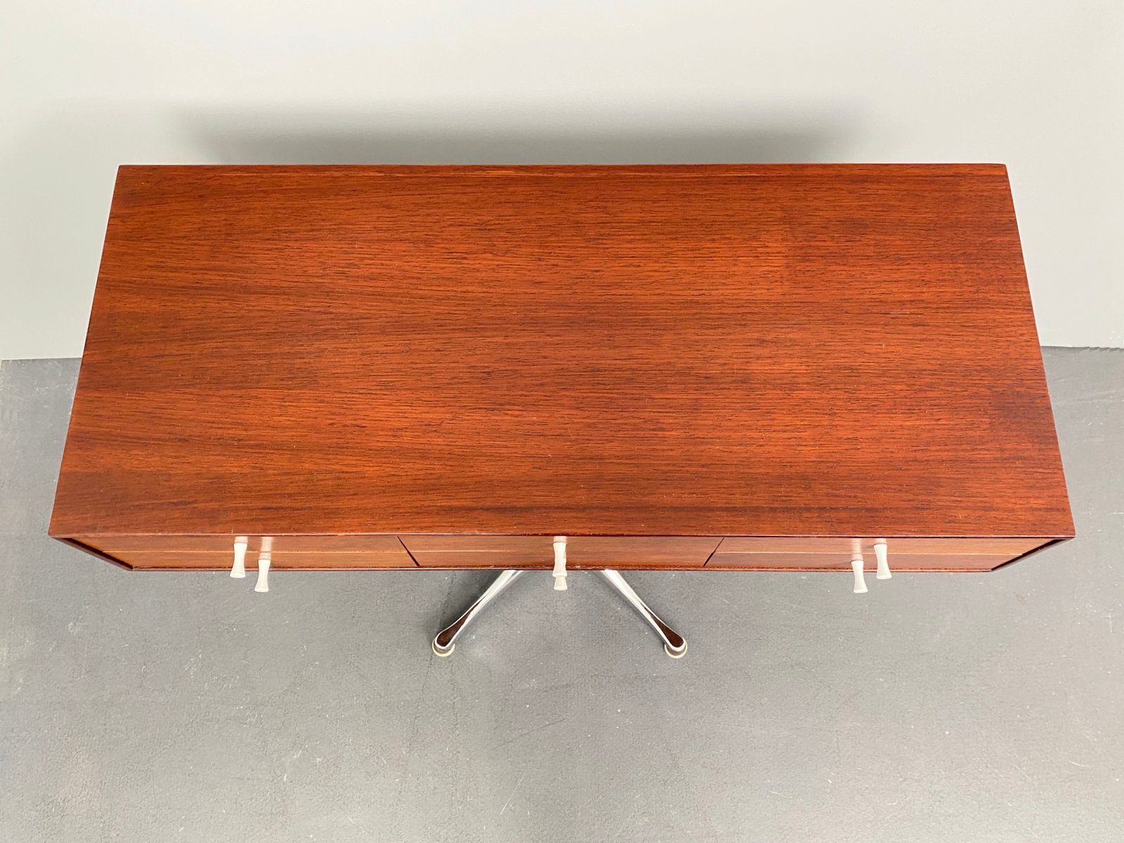 In 1935, Nelson became associate editor of Architecture Forum and Fortune magazines, for whom he continued to work through the 1940s. His writing drew the attention of D.J. DePree, president of Michigan-based furniture manufacturer Herman Miller, and Nelson subsequently designed his first collection for the brand in 1945; in 1947, he became the company’s design director. There he designed hundreds of furniture pieces and recruited rising design talents including Isamu Noguchi and Charles and Ray Eames, among others.