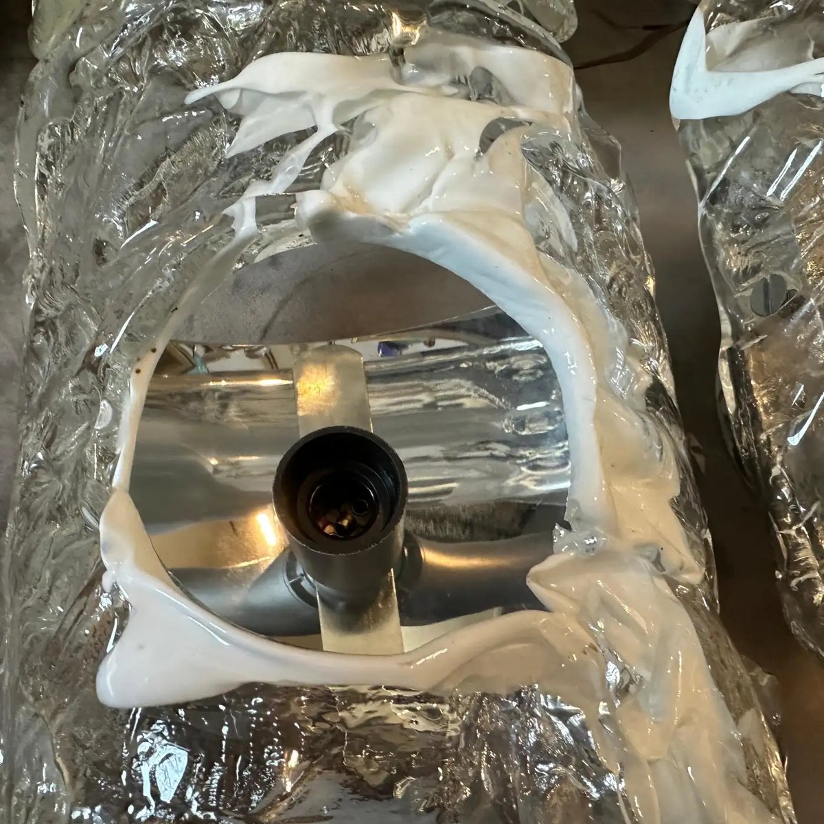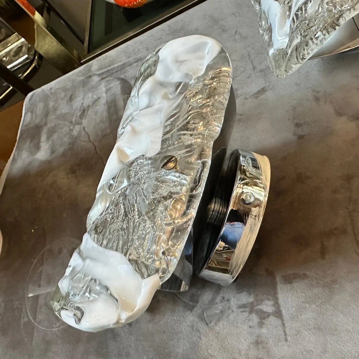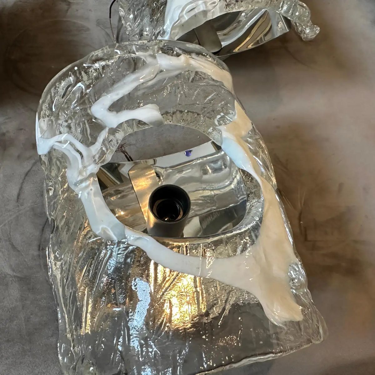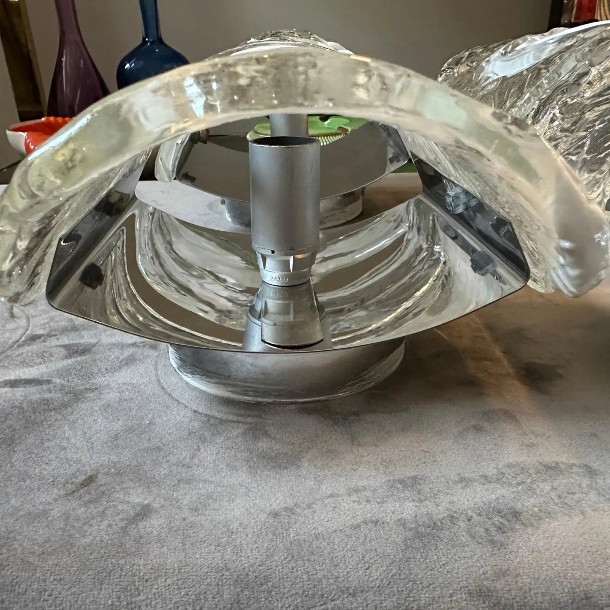 Spage Age Clear and White Murano Glass and Steel Wall Sconces attributed to Mazzega, 1970s, Set of 2