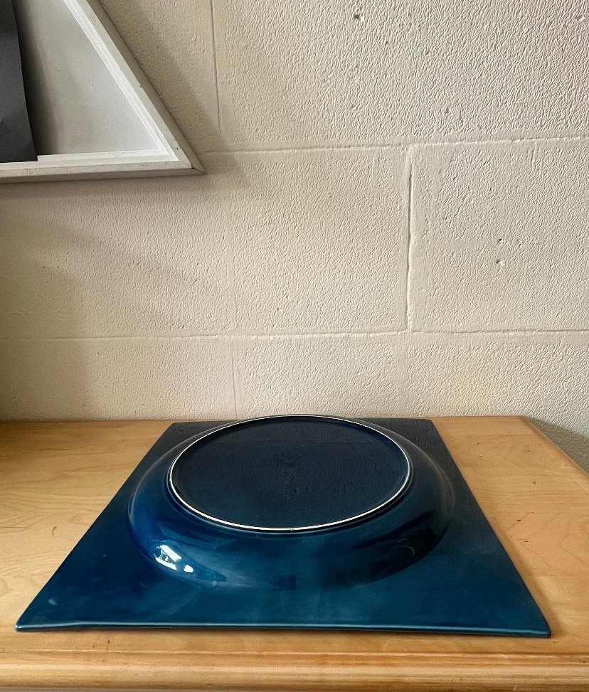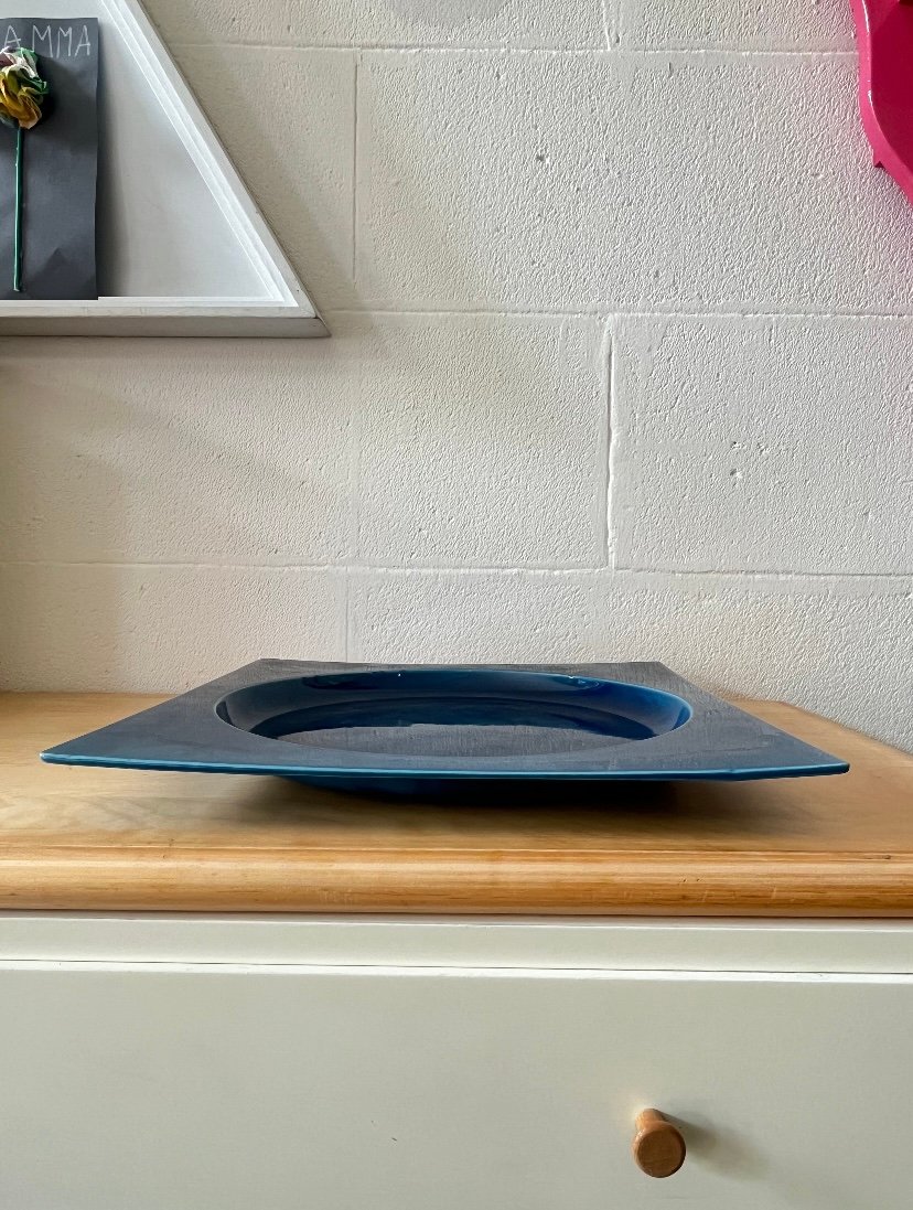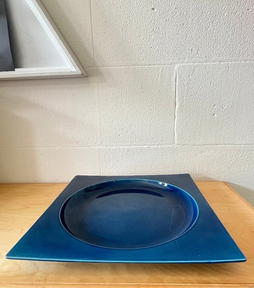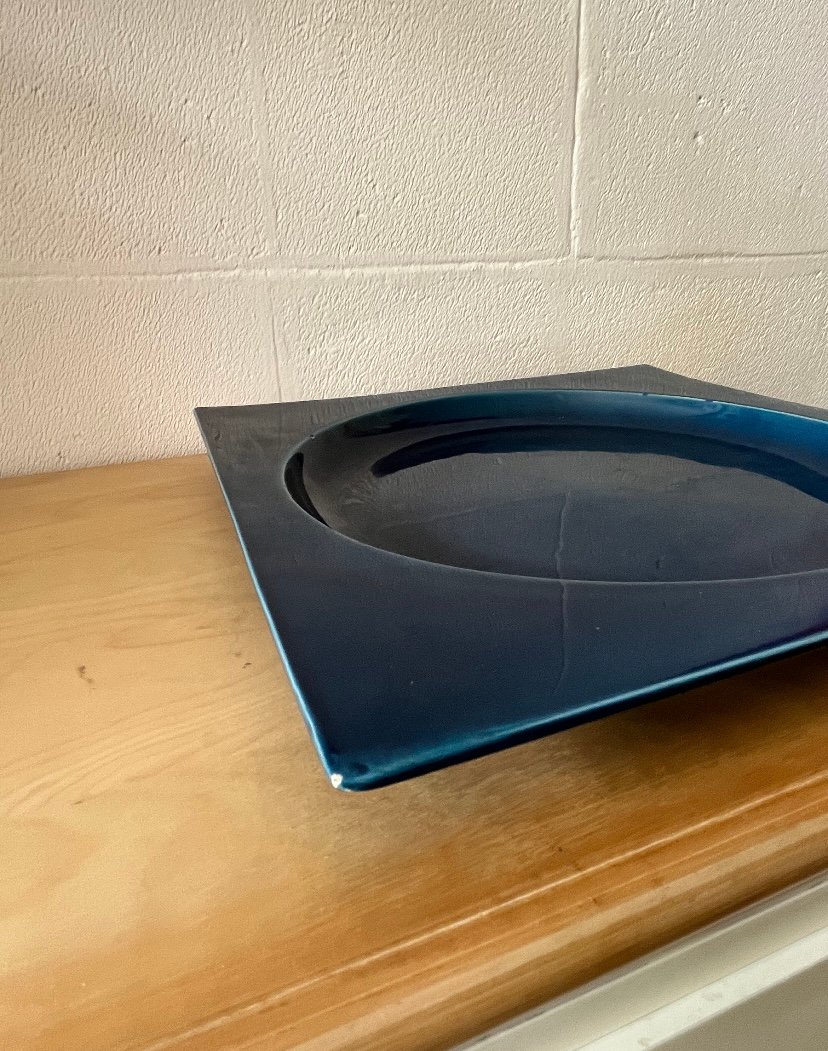 Square Blue Glazed Ceramic Plate, Italy, 1970s