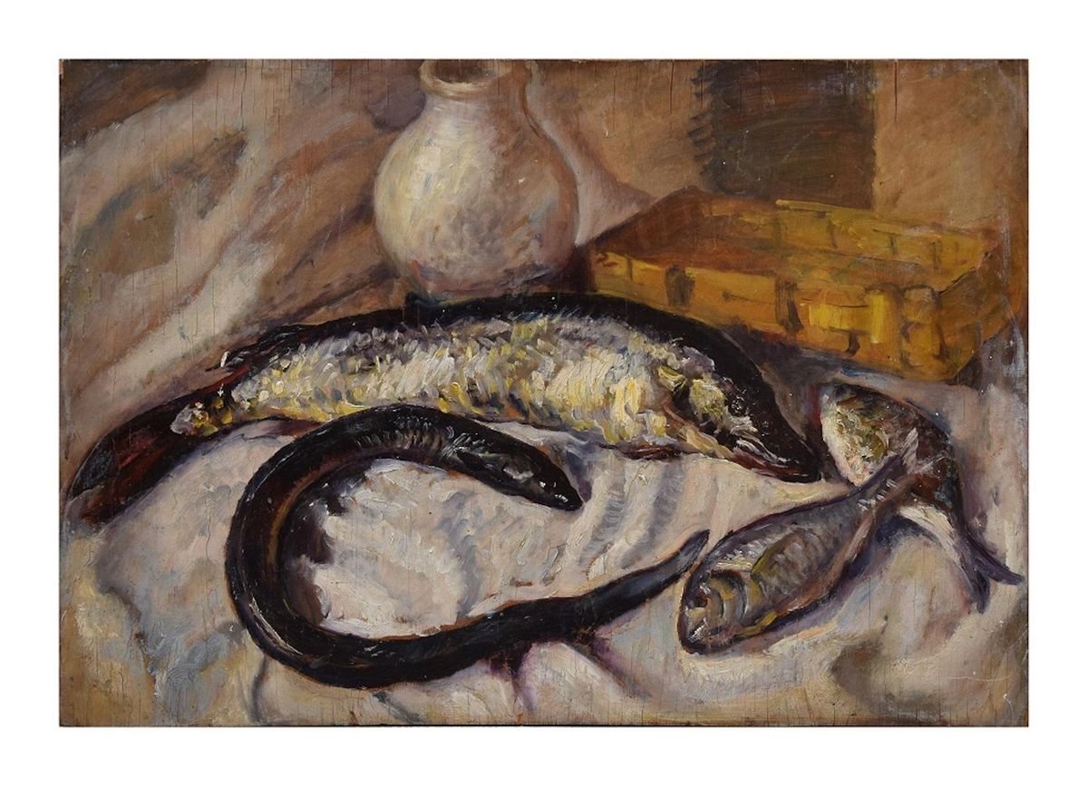 Still Life with Fishes - Original Oil on Wood Panel 1935 ca.