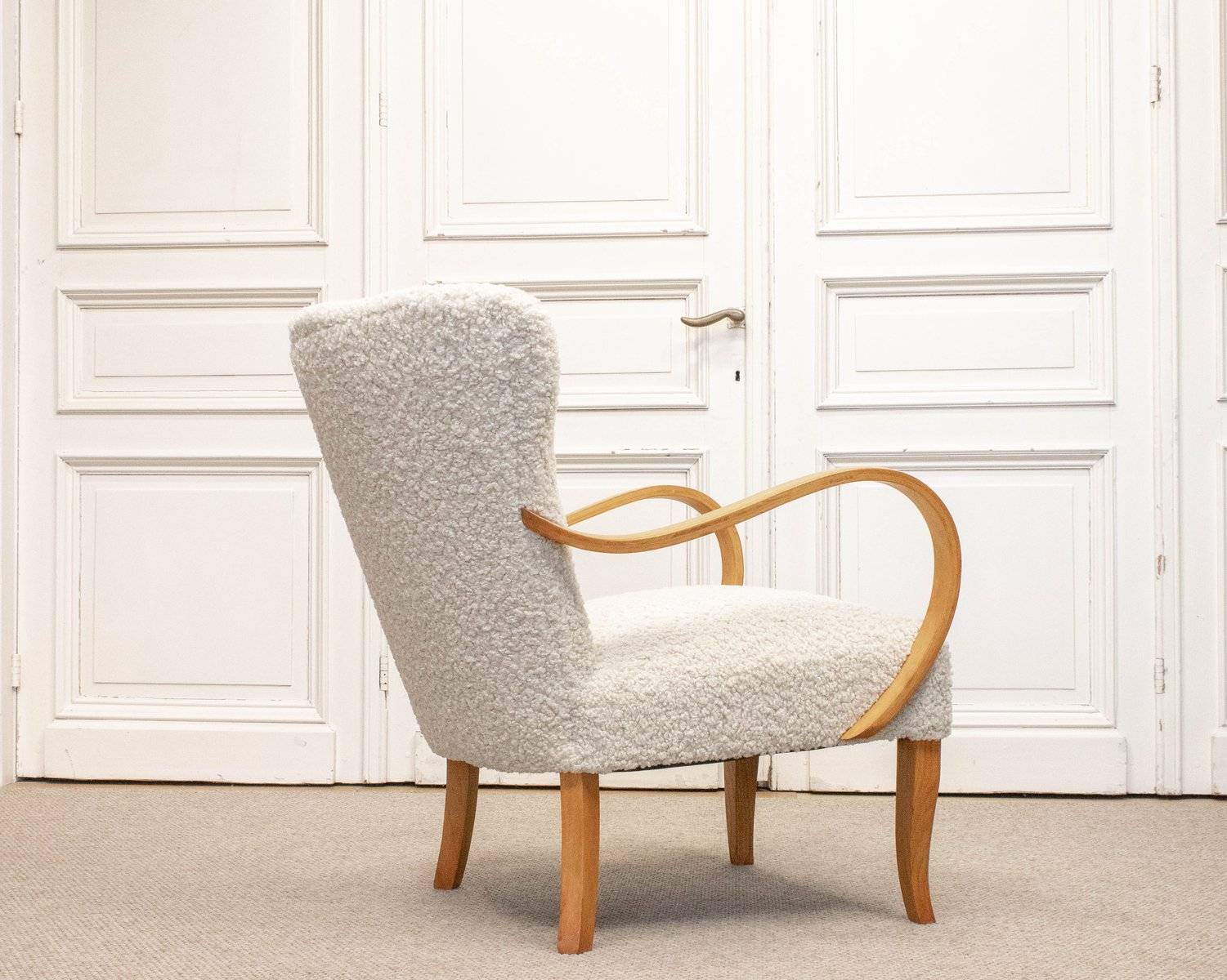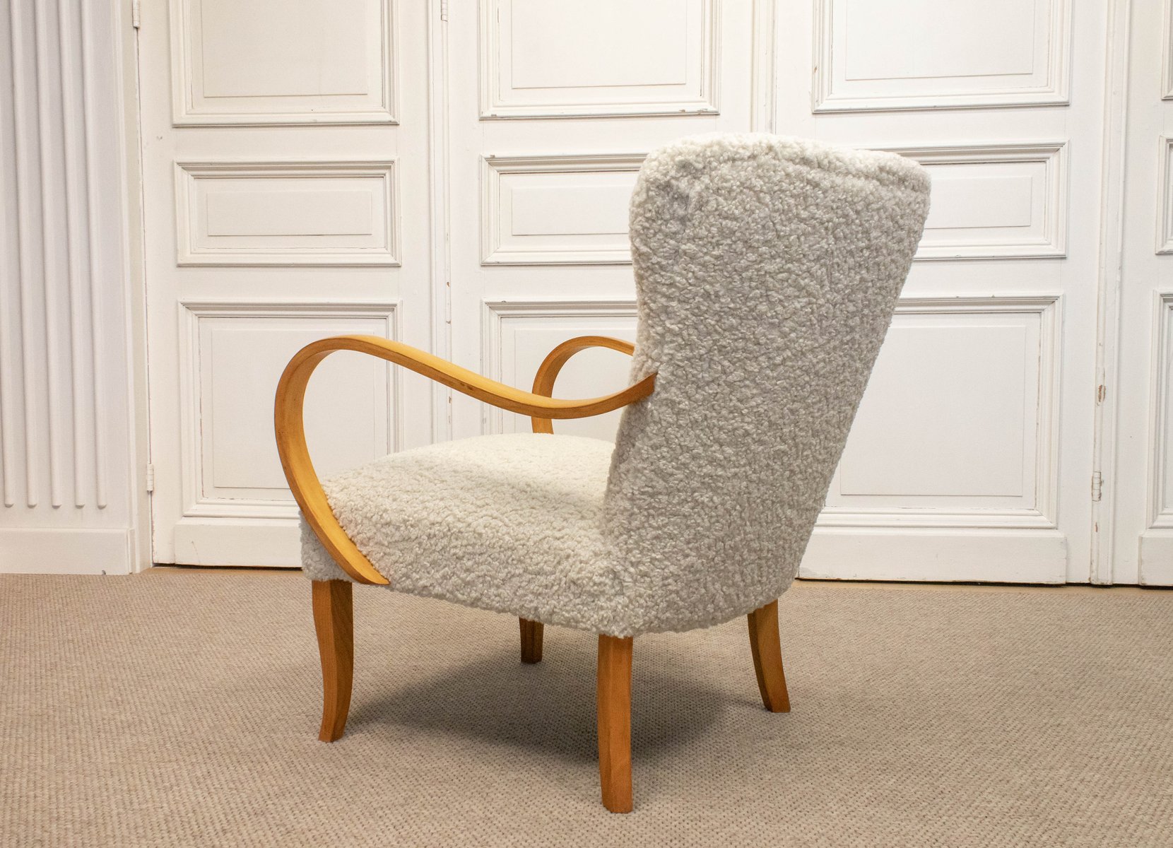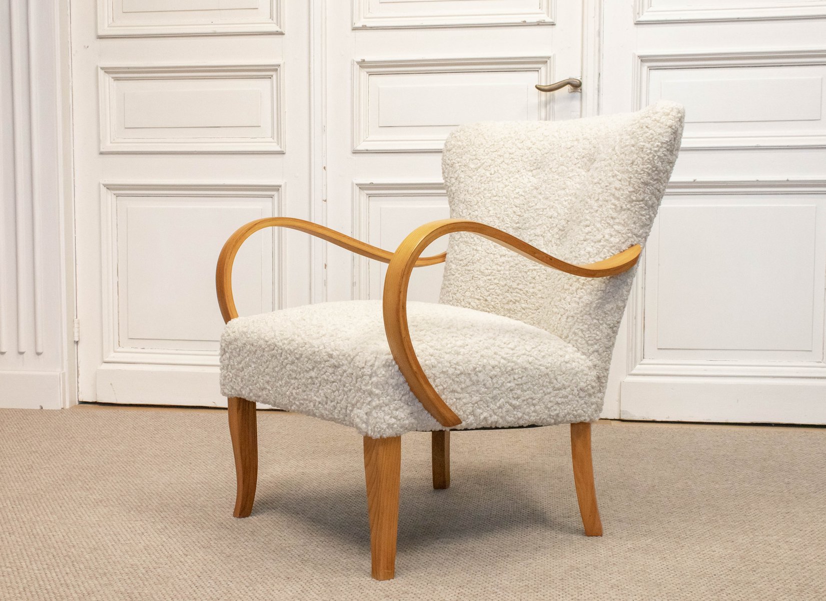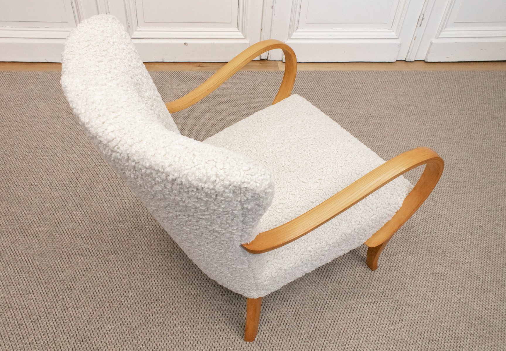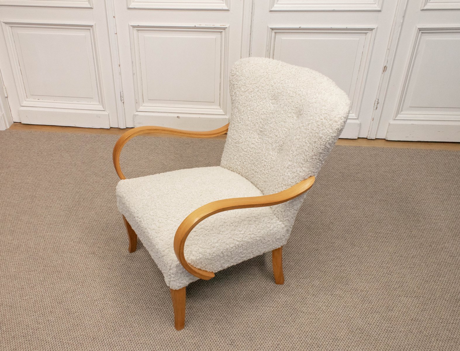 Swedish Lounge Chair in Elm Wood with Teddy Fur Upholstery, 1950s