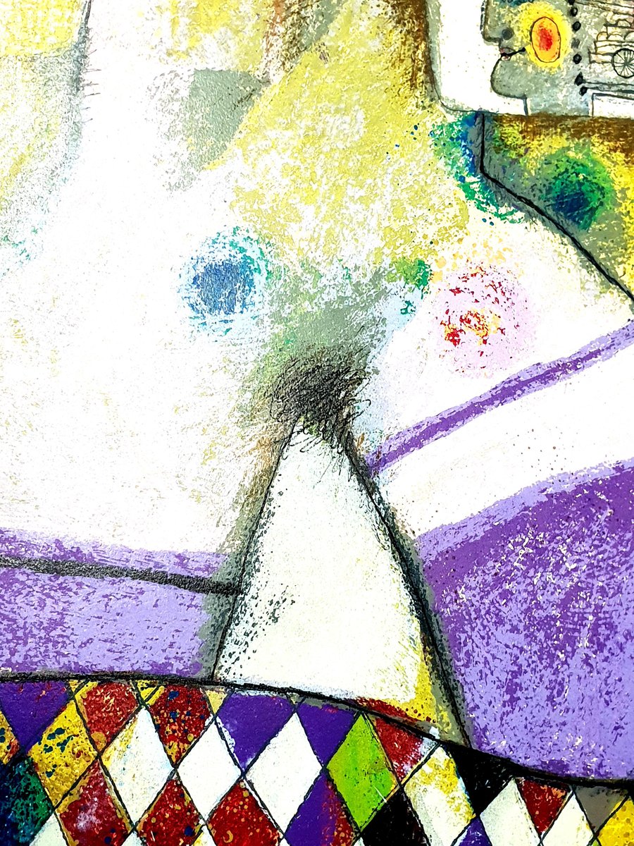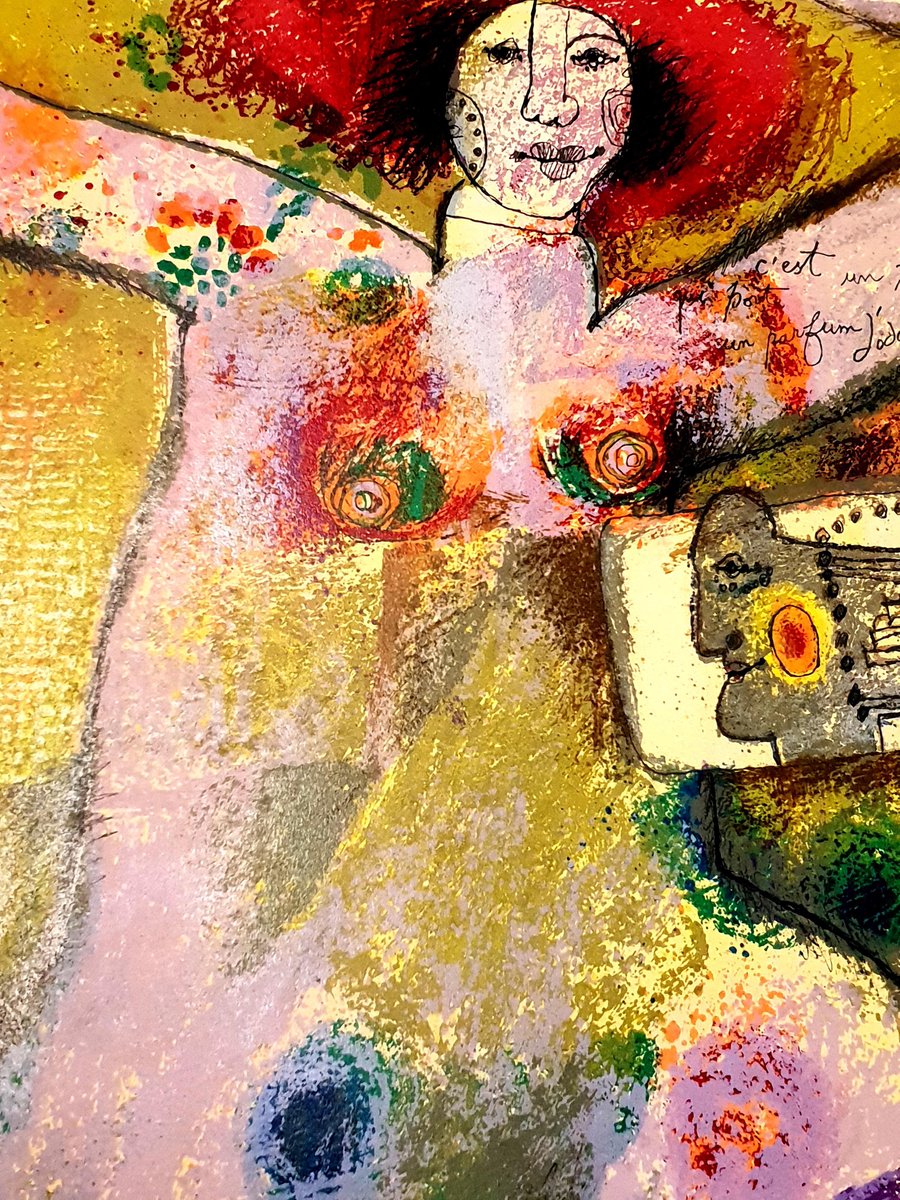 Théo Tobiasse Title: C'est un train portant un parfum d'odalisque Signed and Numbered Dimensions: 57 x 76 cm Information : Edition of 175 Condition : Excellent Theo Tobiasse (born in 1927) Theo Tobiasse, master of the Paris School, was born in Jaffa, Israel in 1927 of Lithuanian parents. His father, a Zionist who was a printer by profession, had brought the family to Jaffa from Lithuania in 1925. Because of financial difficulties, the family returned to Lithuania when Tobiasse was still very young. However, by 1931 the family had settled in Paris. Tobiasse has never forgotten his first sight of Paris, the City of Light. During the Nazi occupation of Paris, the Tobiasse family lived hidden for two years in a minuscule apartment in Paris. From July, 1942 through August, 1944, the family never ventured outside, nor would they turn on the lights or burn candles. By the feeble light that filtered through the closed shutters, Theo spent his time reading, drawing, and playing chess with his father. The chessboard pattern seen in many of Theo’s paintings is symbolic of this time in his life. The only indication of time passing was the sound of Nazi boots in the streets and on the staircase of their house - more than once they were very close to being discovered. On August 25, 1944 Paris was liberated, and Theo walked out of the apartment with a large portfolio of drawings into the light of a cloudy day. It’s interesting to note that LeRoy Neiman was with the U.S. Army that liberated Paris that day! After the war Tobiasse worked for 15 years as a very successful advertising artist, first in Paris and then in Nice. He painted as often as he could during this time, often at night. In 1960 he entered his first art show and won the Grand Prize. Since 1961, Tobiasse has enjoyed incredible success as far afield as New York, Paris, Tel Aviv, Caracas and Tokyo, in all of which he has had one-man shows. Art Expo New York, the world’s largest art trade show, listed Tobiasse as one of the only Museum Quality artists represented when American Fine Art exhibited his works there in 1998. A sentimental and private individual, Tobiasse puts his innermost feelings into all of his works and his little “secret” into his original paintings: a personal message which he writes in Yiddish and then glues onto the canvas before painting or collageing over it. No one will ever know the message without destroying the painting itself! Tobiasse’s art is a product of intellect, submerged memories and laborious experimentation with various media. As Chagall and Picasso did before him, Tobiasse looks deeper into his work, seeking to express the inner world of man. Surrealism taught him to be experimental, to juxtapose pictorial elements in order to redefine them. He welcomes the new freedom of the 20th Century where there are no rules. Space can be twisted, altered, folded and rendered by its own reality. His influences are as diverse as the etchings on a teapot carried from Lithuania to the Winged Victory as it is set in the Louvre. He imitates no one, but has sensitively collected imagery which evolves into an art that is truly his. It is the brilliant vision of Theo Tobiasse, expressed in his work, that echoes the vocabulary of modern art.