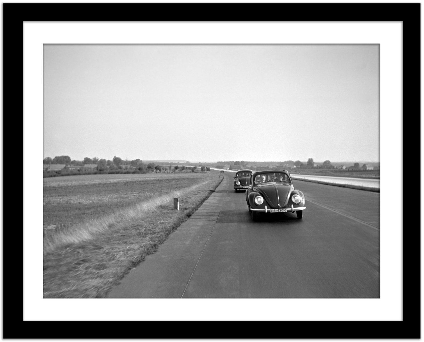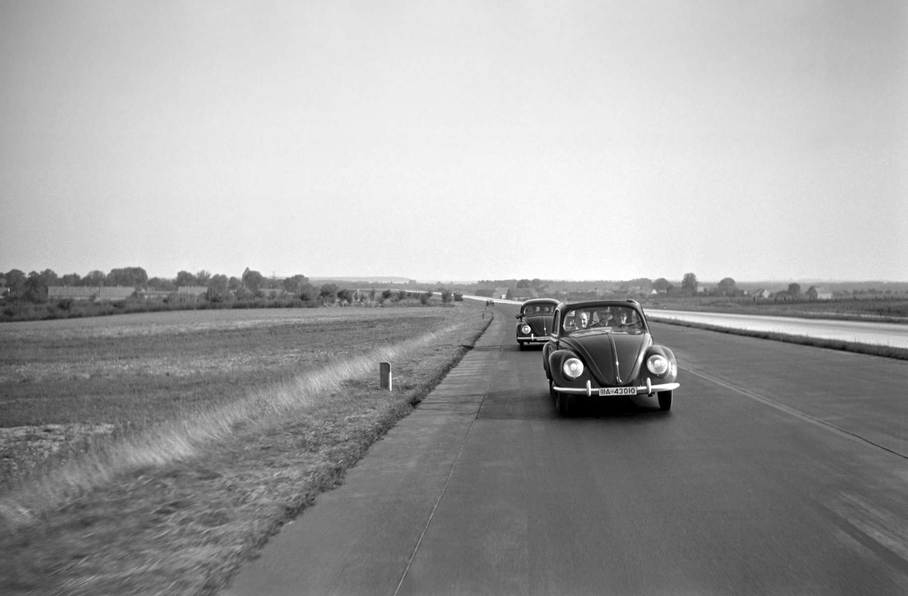 Two Volkswagen Beetles on the Highway, Germany, 1938