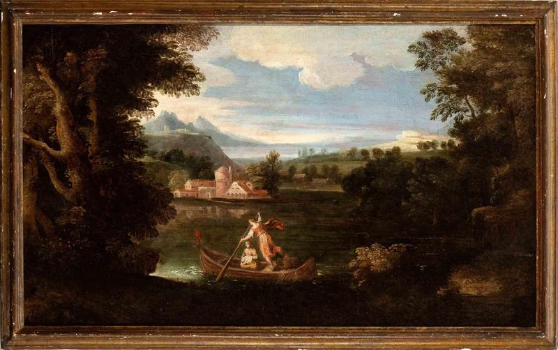 Unknown, River Landscape with Boat and Two Figures, Oil Painting, 17th Century