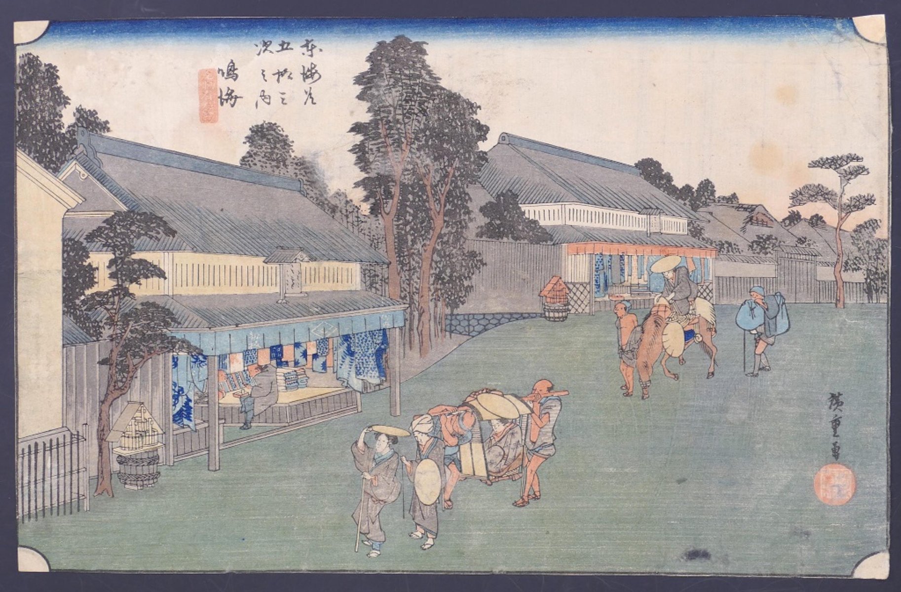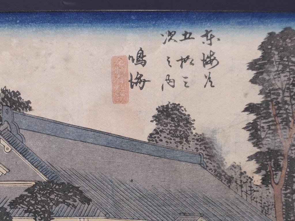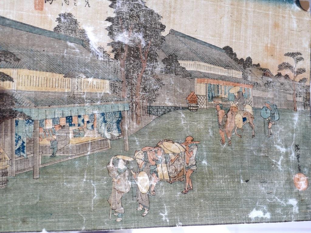 Narumi is a polychrome woodblock print, a original plate from the series Tôkaidô gojûsan tsugi no uchi, (Fifty-three Stations of the Tôkaidô, also known as the First Tôkaidô or Great Tôkaidô), designed by Utagawa Hiroshige (歌川 広重, 1797-1858) after his travel along the Tokaido in 1832, around 1833. This plate, in horizontal oban, Hoeido edition, reports in Japanese ideograms the signature of the artist, and the Censor's seal and Seal of Date Thanks to this original Hiroshige’s plate, we remember and associate the Station of Narumi with the famous Arimatsu Dyeing Shops in Narumi. In fact in front of this place lies Arimatsu, a place famous for its tie-dyed cloth. Arimatsu Cloth developed under the patronage of the Tokugawa family, the Owari branch, and become one of the main products of that area. Summer Kimono, wrapping clothes, and kimono belts, and much more were made from cotton cloth tie-dyed with Japanese indigo blue or red and were popular. Because of the fact the cloth was also sold at the Narumi station, it is also called Narumi Cloth. This superb print is able to take us in another world, and in another epoca, recording the Japanese customs and traditions. A copy of the same our specimen is preserved at the Nakagawa-machi bato Hiroshige Art Museum, Nasu-gun, Japon In good condition, except for aging signs (discolorations or stains, thinness of the paper), this original print, rich of precious and fine details, has preserved still today its beauty and charme, showing the talented graphic touch of Hiroshige. Provenance: Wuerttemberg private collection, assembled between the 1950s and 2000. Collect this superb Japanese view by a old master of the ukiyo-e, Hiroshige, to embellish your house with a sophisticated Oriental touch! The Fifty-Three Stations of the Tōkaidō (東海道五十三次, Tōkaidō Gojūsan-tsugi), is a series of ukiyo-e woodcut prints created by Utagawa Hiroshige after his first travel along the Tōkaidō in 1832. The Fifty-Three Stations of the Tōkaidō was such a popular subject that led Hiroshige to create some 30 series of woodcut prints on it, all very different one from the other by their size (ōban or chuban), their designs or even their number (some series include just a few prints). The Hōeidō edition of the Tōkaidō is Hiroshige's best known work, and the best sold ever ukiyo-e Japanese prints. Created after Hokusai's Thirty-six Views of Mount Fuji series, this print series established this new major theme of ukiyo-e, the landscape print, or fūkei-ga, with a special focus on "famous views" (meisho). Hiroshige's series met a full success, not only in Japan, but later in Western countries.