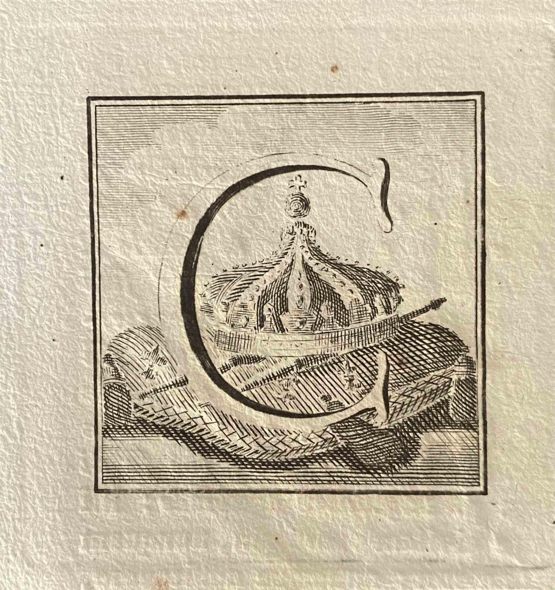 Capital letter for the Antiquities of Herculaneum Exposed, original etching from the end of the 18th century, made by Various Old Masters. In very good condition, except for some stains along the margins. In this work the letter that appears in the foreground is the C, with a royal crown in the background. On the back, printed writings certainly derived from. The etching belongs to the print-series Antichità di Ercolano Esposte (original title: Le Antichità di Ercolano Esposte), eight volumes of engravings of the finds from the excavation of the ruins of Herculaneum in the Kingdom of Naples (today Campania, Italy). It was published between 1757 and 1792 by the Regia Stamperia and later these copies were delivered to selected recipients throughout Europe. Despite the title, the Antiquity of Herculaneum shows objects from all the excavations undertaken by the Bourbons in the Gulf of Naples. These include Pompeii, Stabia and two sites of Herculaneum: Resina and Portici. The Bourbon king Charles commissioned fifteen scholars to create a new “Herculaneum Academy” to study the finds and publish the results of the archaeological excavations of the sites. The engravings are of high quality and the accompanying text shows a large scholarship. They were made by 25 leading artists involved by the King to prepare drawings and engravings on the finds, among which we find Giovanni Elia Morghen, Carlo Nolli, Luigi Vanvitelli and Giovanni Battista Casanova. The "Antiquity" was designed more to amaze readers with the quality of the objects in the collection of the King of Naples than to be used in research, following and increasing the interest of eighteenth-century society for classical culture and art in particular. Through the exaltation of the classical concept of proportion and harmony, the book inspired the neoclassical movement in Europe, giving artists and decorators access to a vast workshop of Hellenistic motifs. Ref .: National Gallery (Washington), Mark J. Millard Architectural, IV (2000), n. 1. L. Garcia y Garcia, Nova bibliotheca Pompeiana (2 v., 1998). Royal Institute of British Architects, British Architectural Library ... First Printed Books, 1 (1994), no. 112. U. Pannuti, Engravers and designers of the Royal Printing House of Naples in the 18th century: the publication of the Antiquities of Herculaneum, in Xenia antiqua, 9 (2000), p. 151-178. V. Trombetta, The edition of The Antiquities of Herculaneum exhibited in Rendiconti of the Academy of Archeology, Letters and Fine Arts of Naples, 59 (1984), p.151-172.