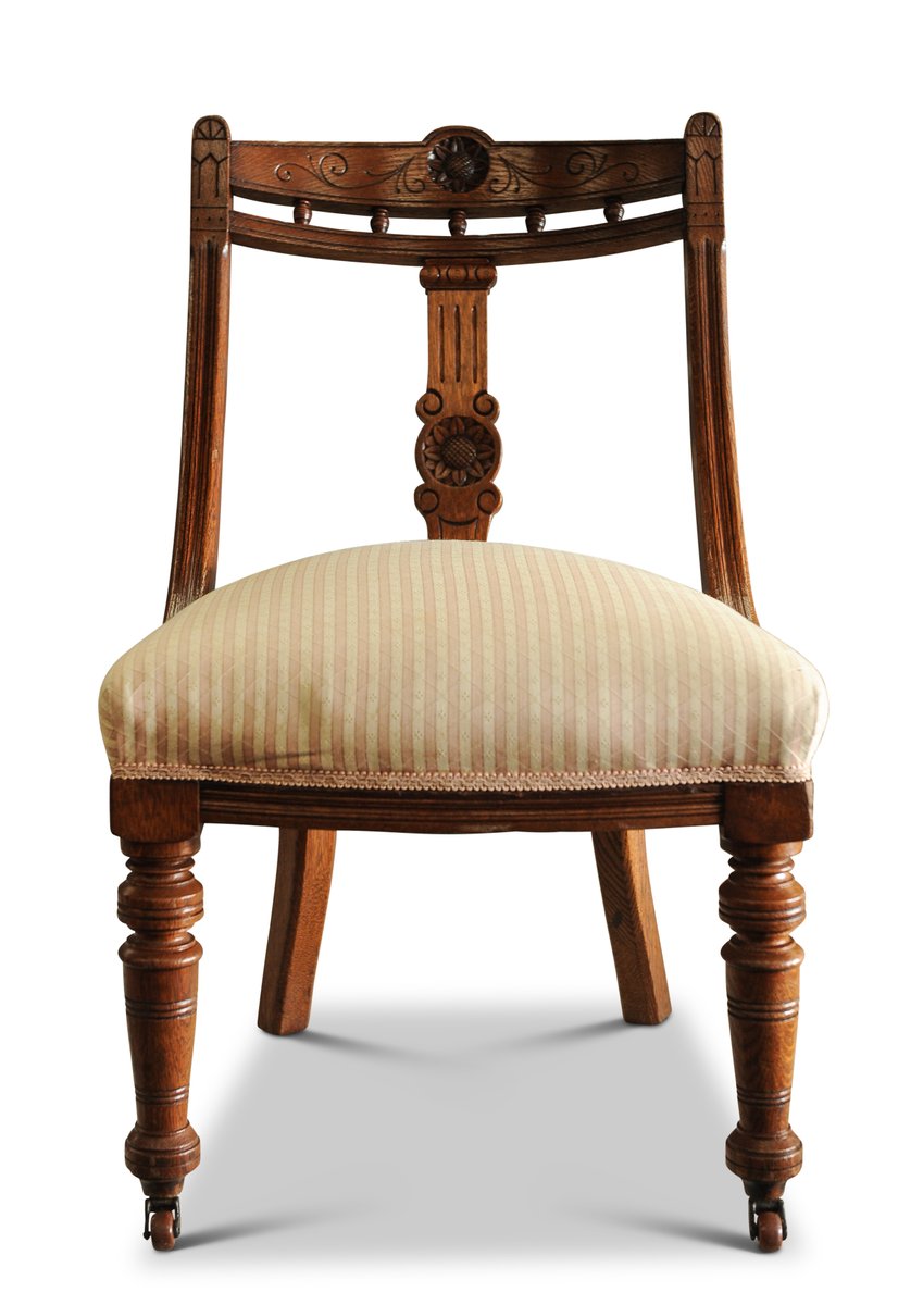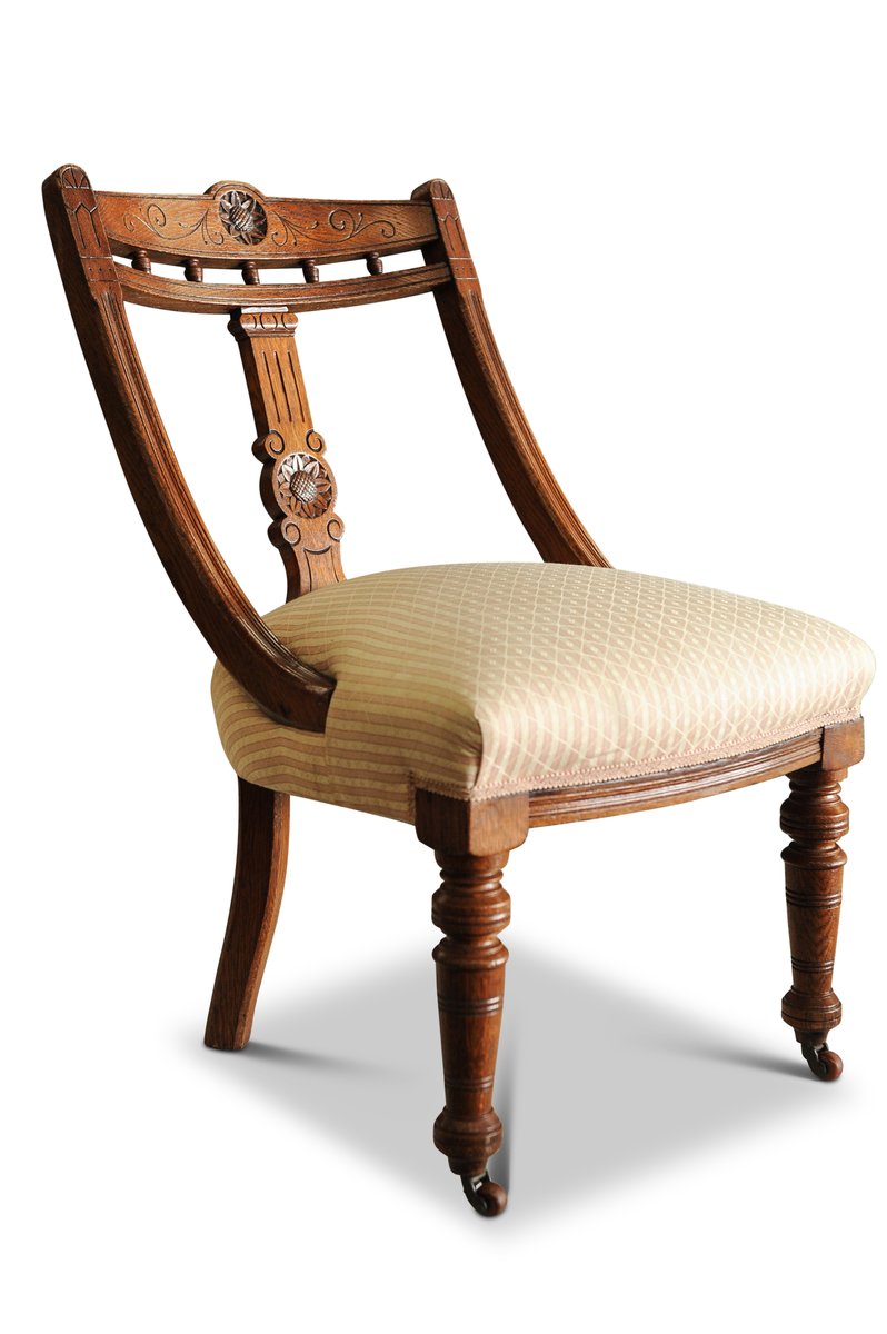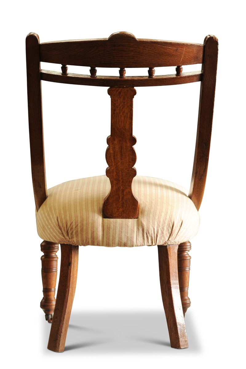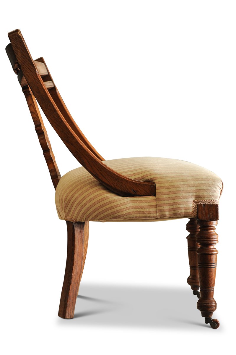 Victorian Striped Upholstery & Oak Open-Frame Library Chair with Carved Motifs & Ceramic Castors