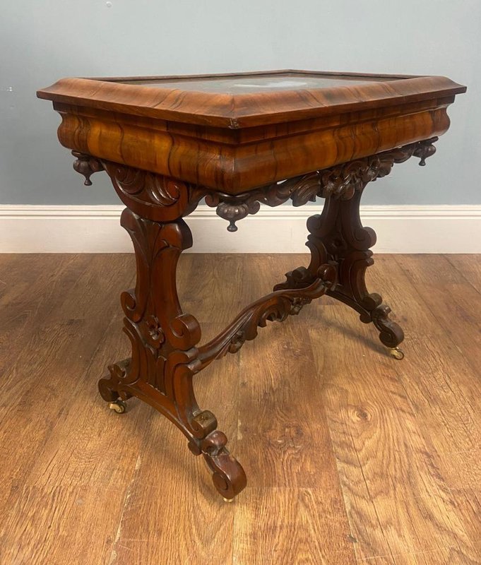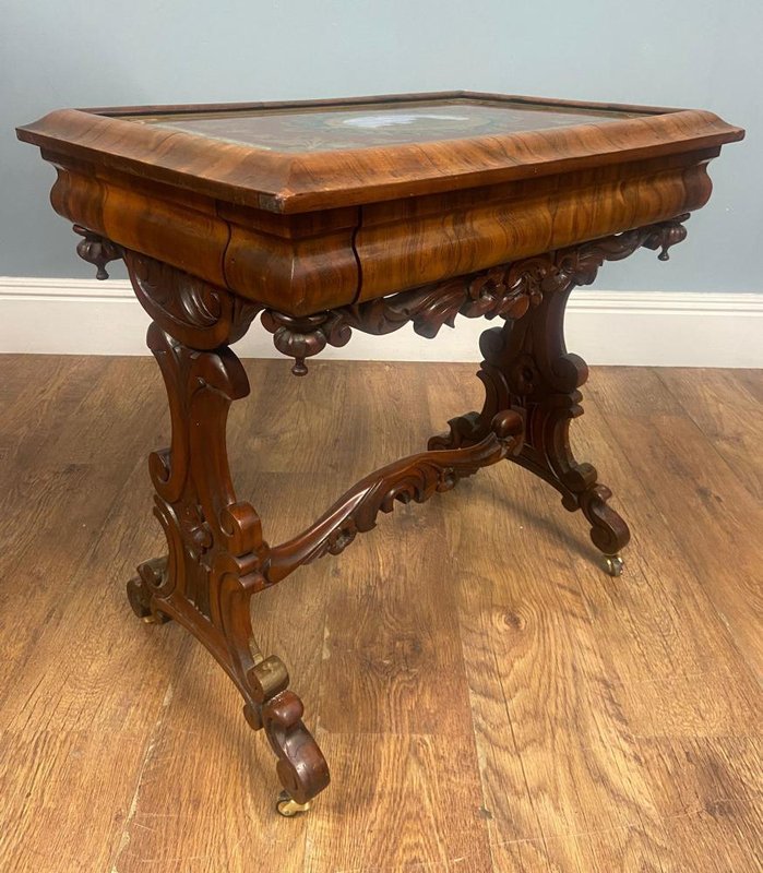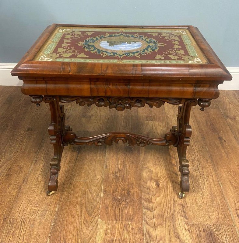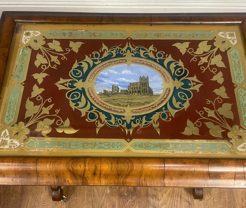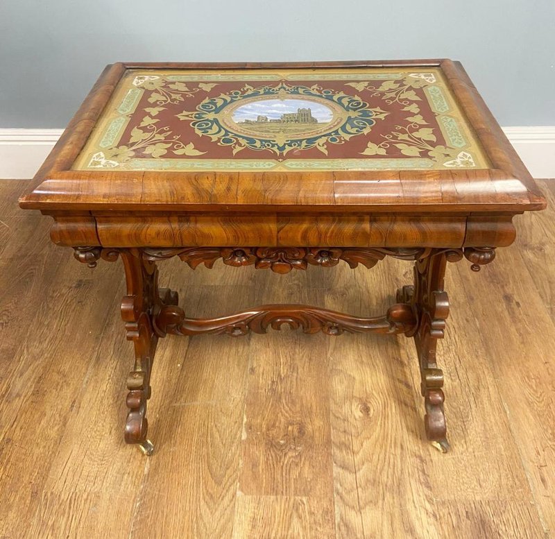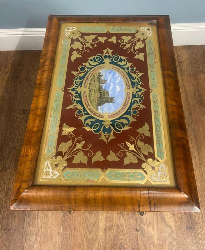 Victorian Walnut Side Table with Whitby Abbey Eglomise Reverse Painting, 1840