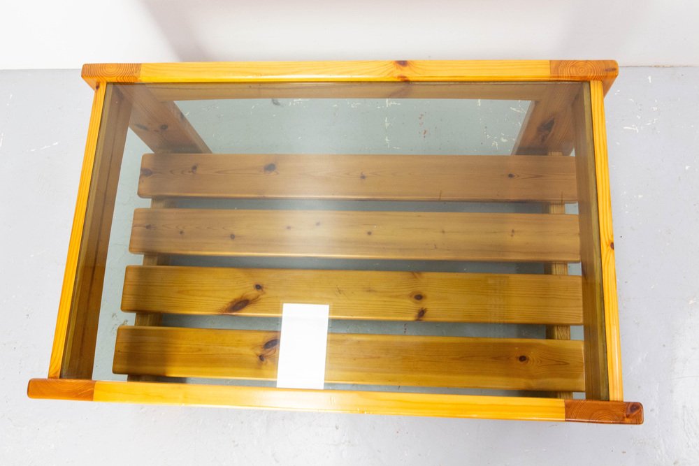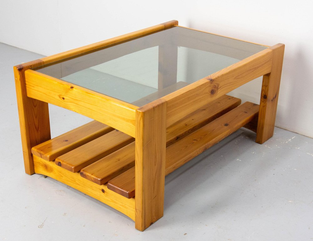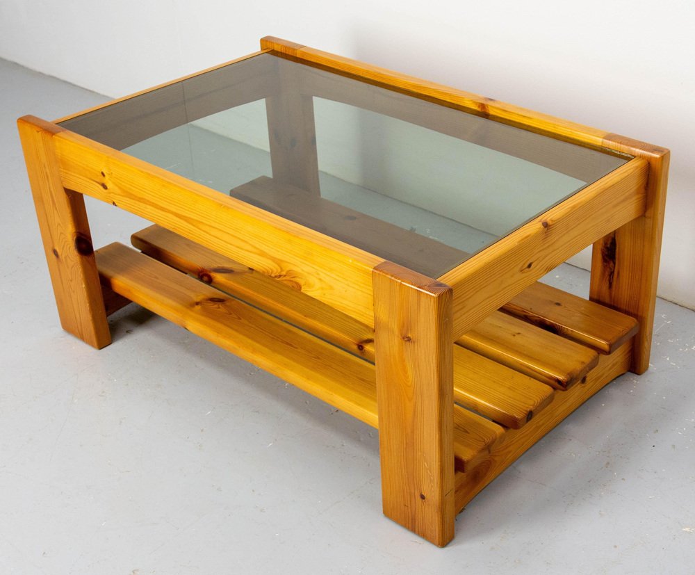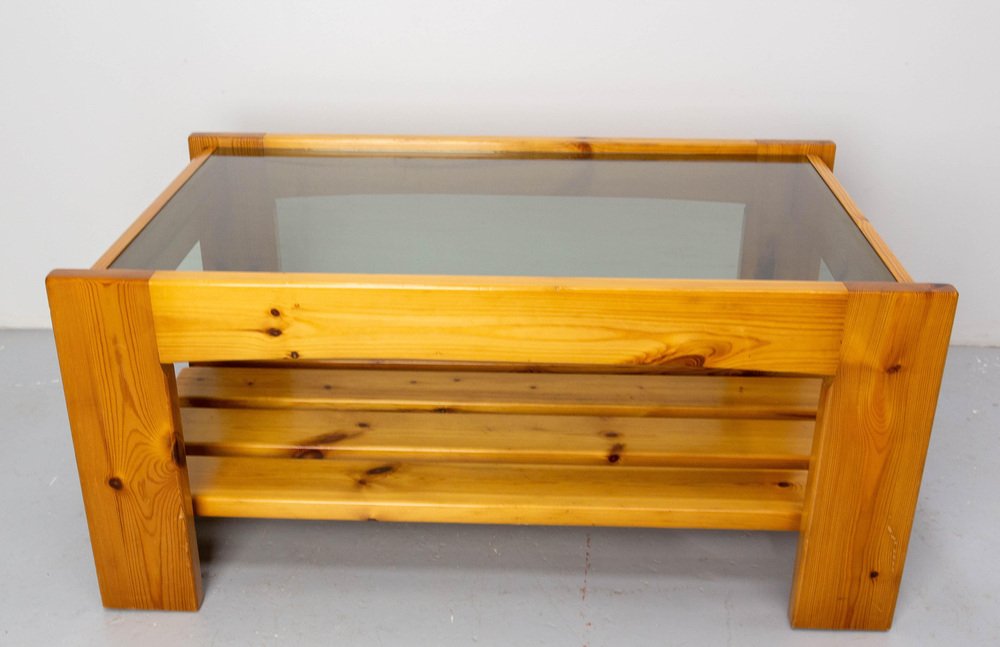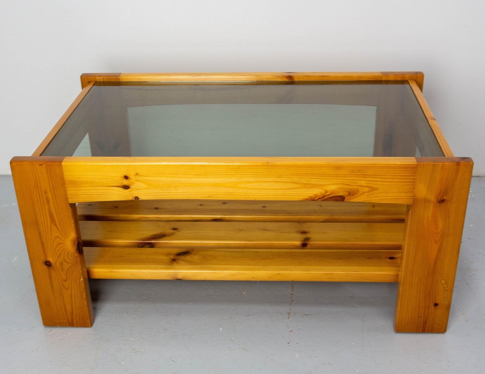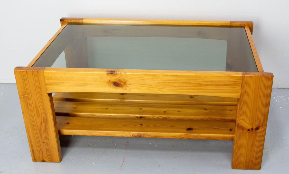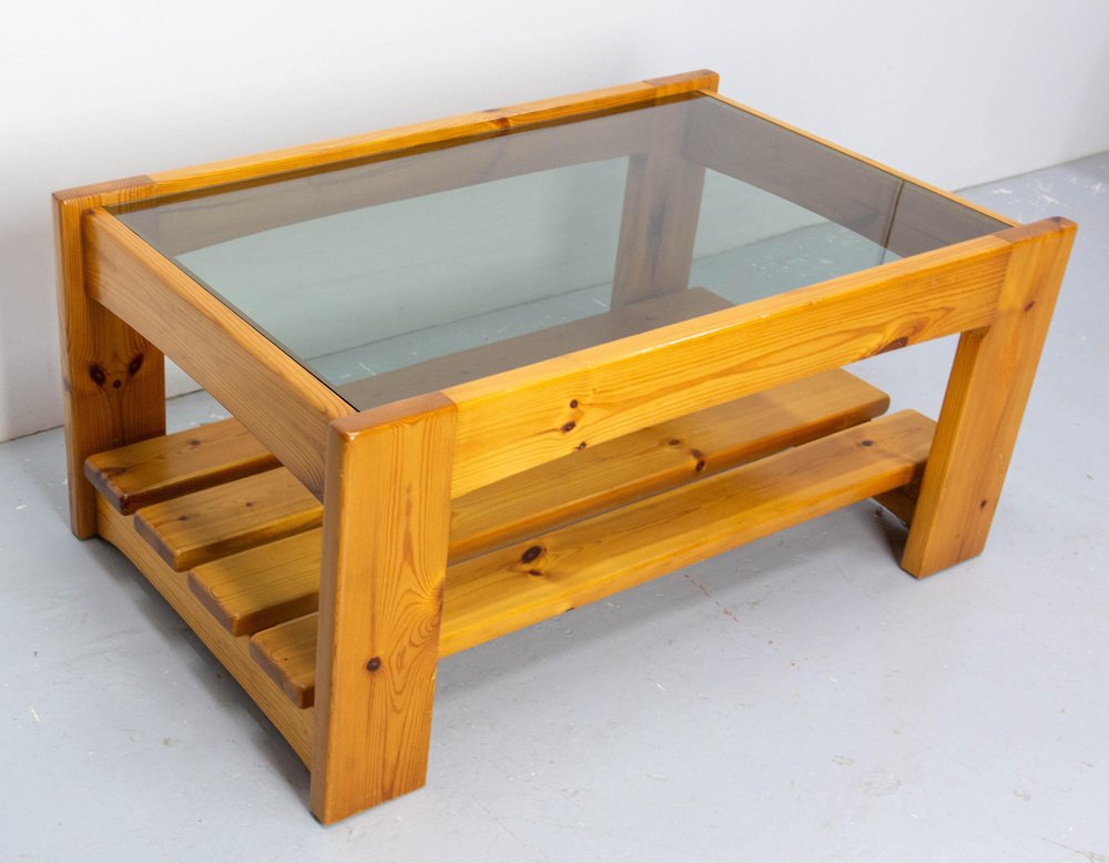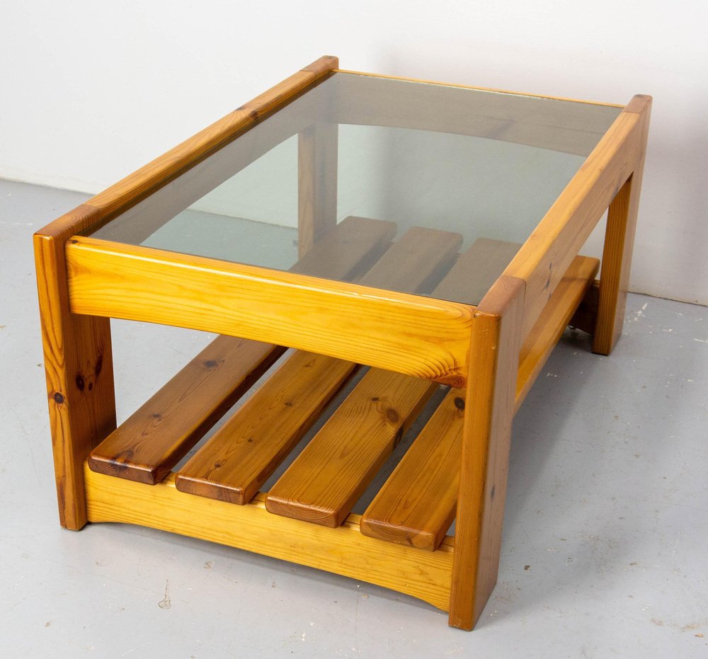 Vintage French Coffee Table in Pine and Smoked Glass, 1980s
