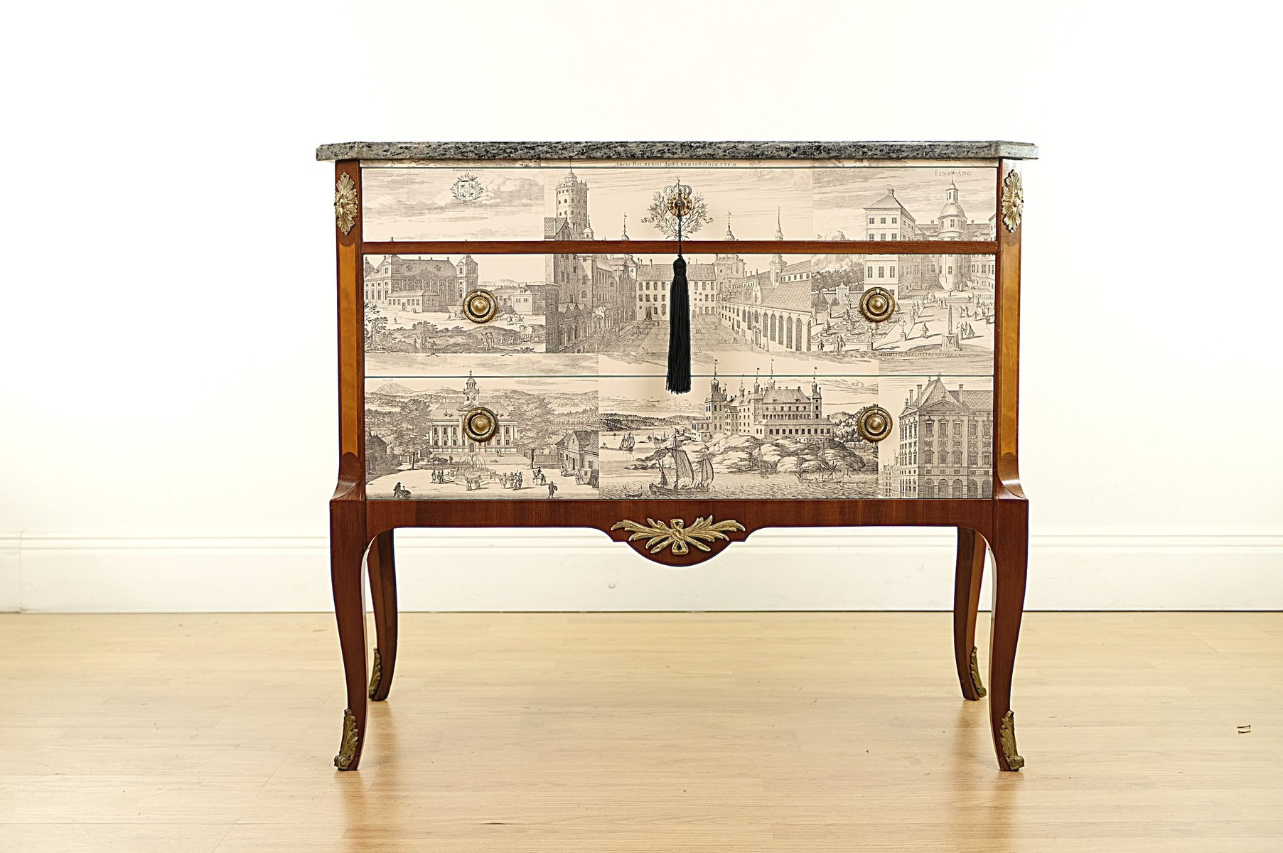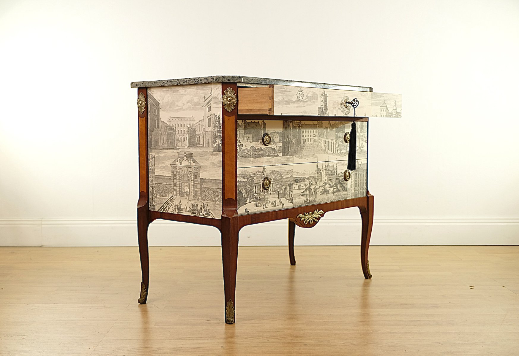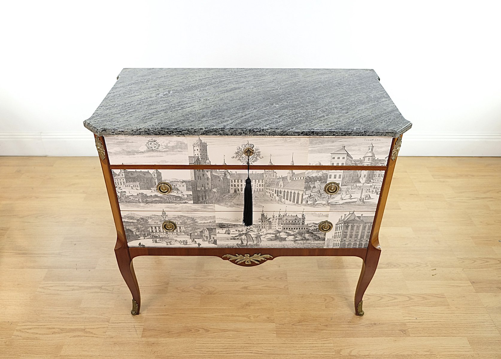 Vintage Gustavian Chest with Illustrations and Grey Marble Slab, Sweden, 1940s