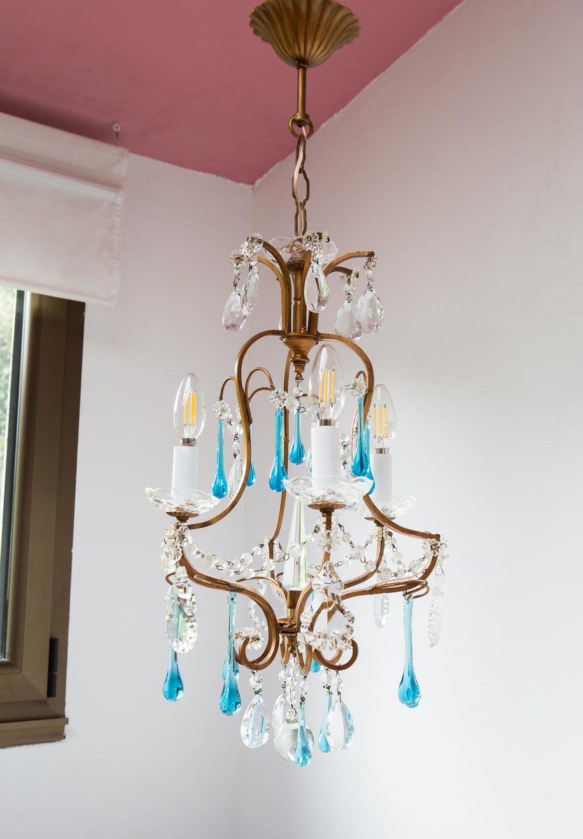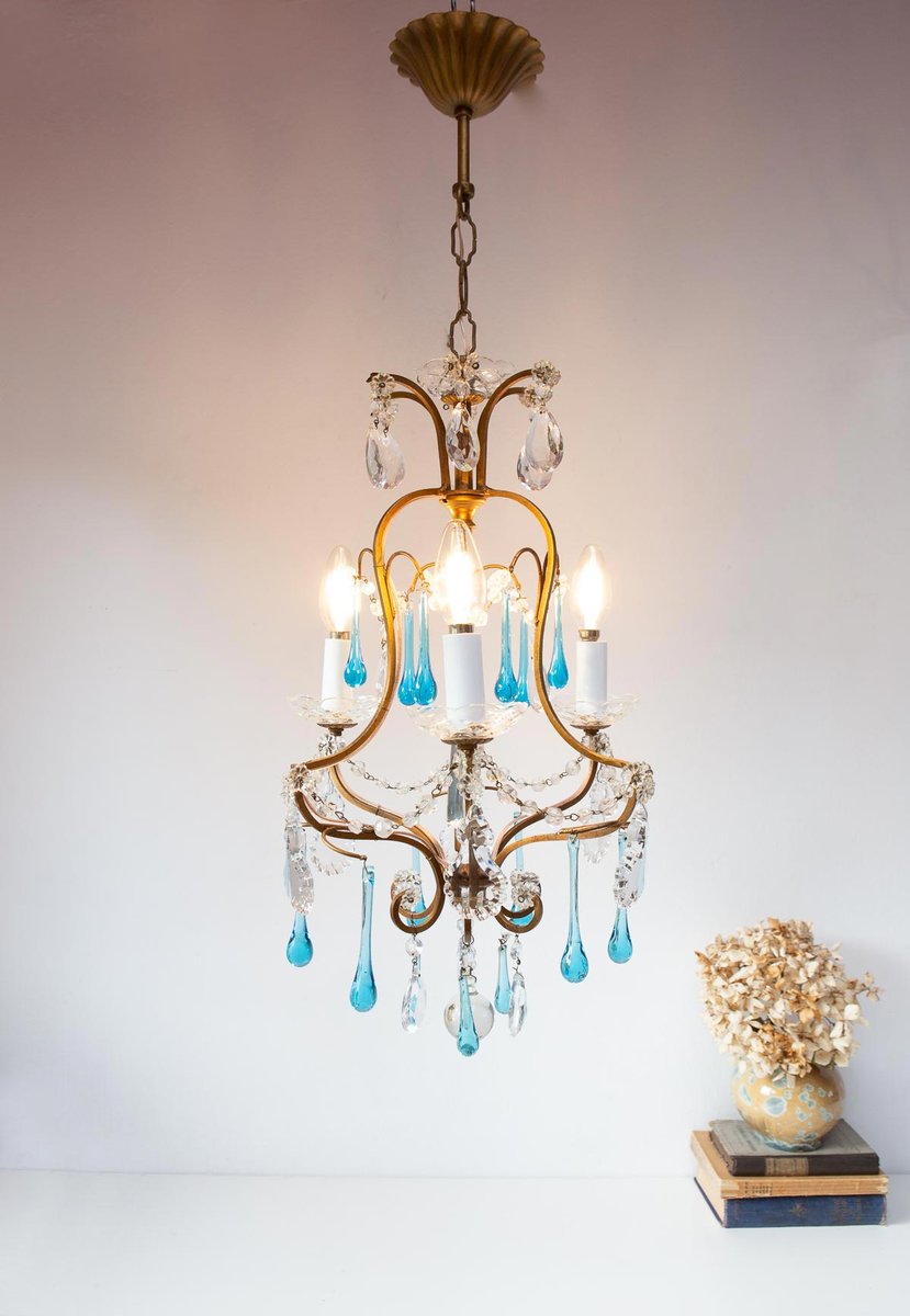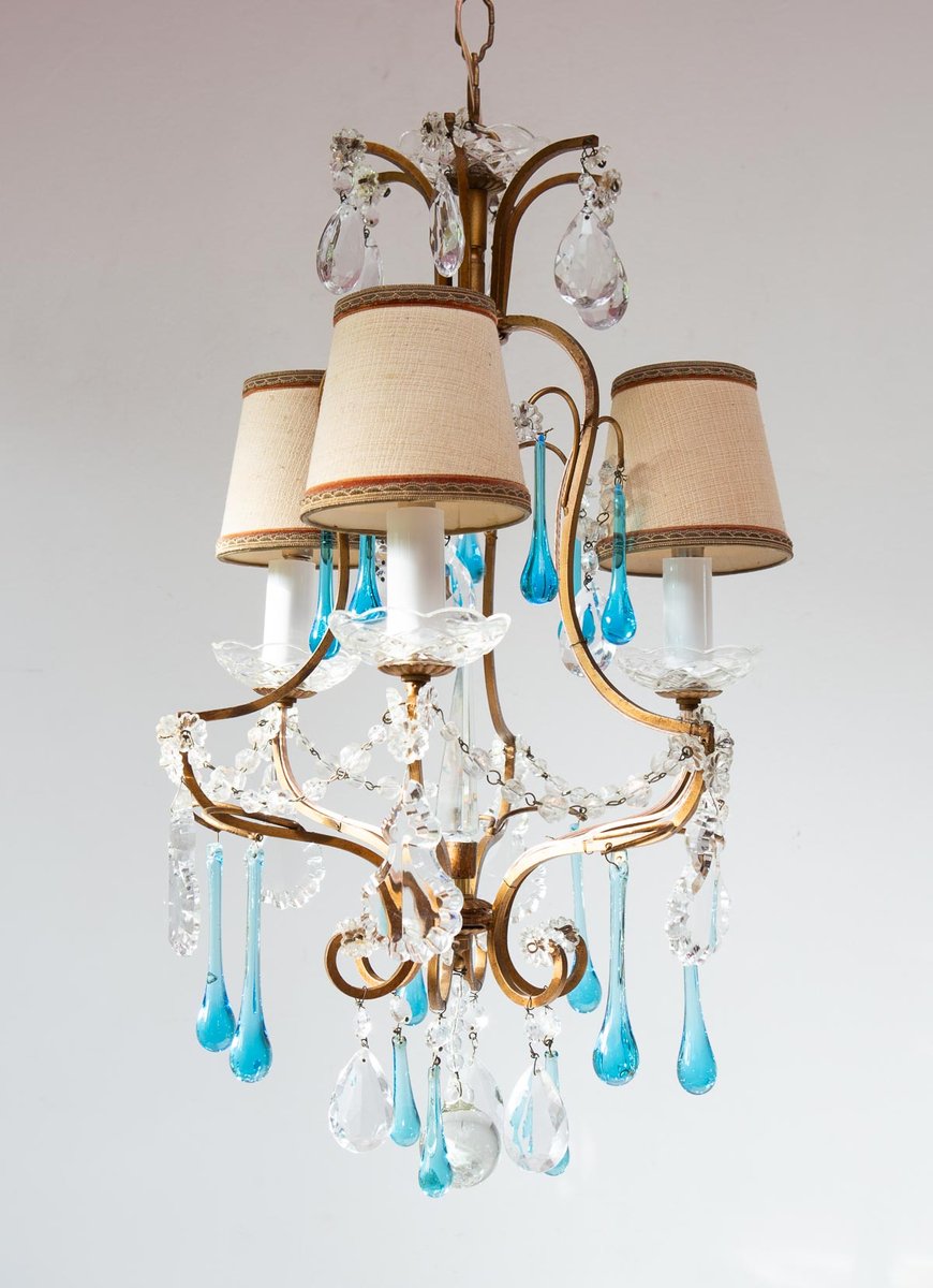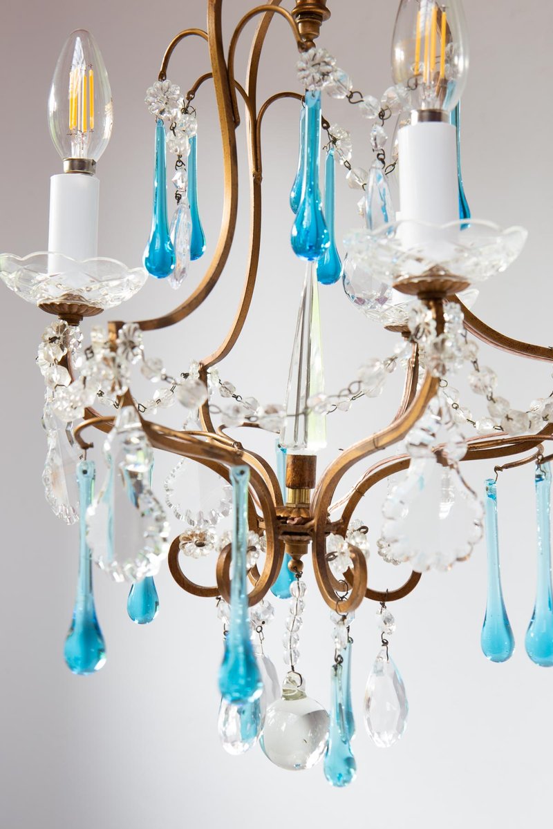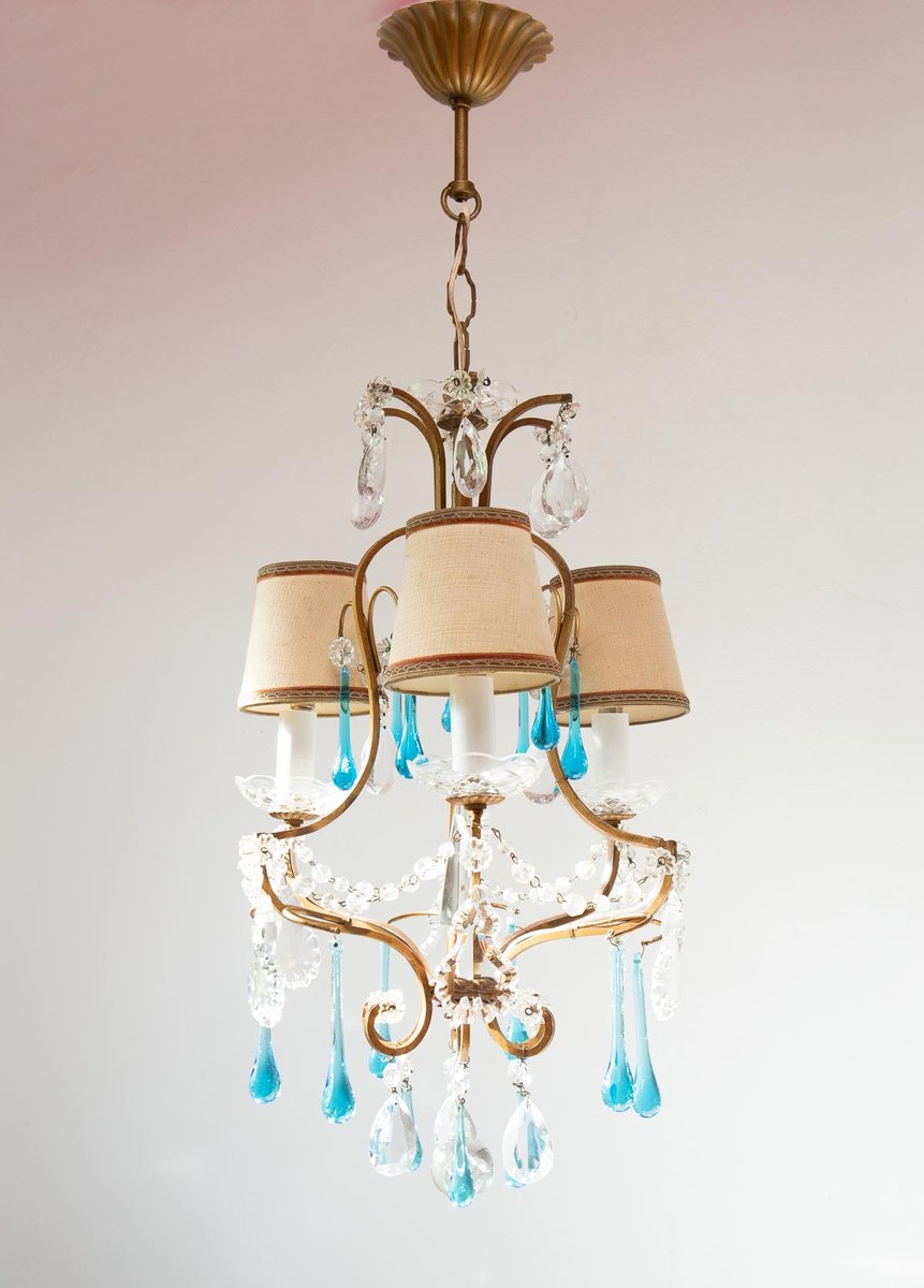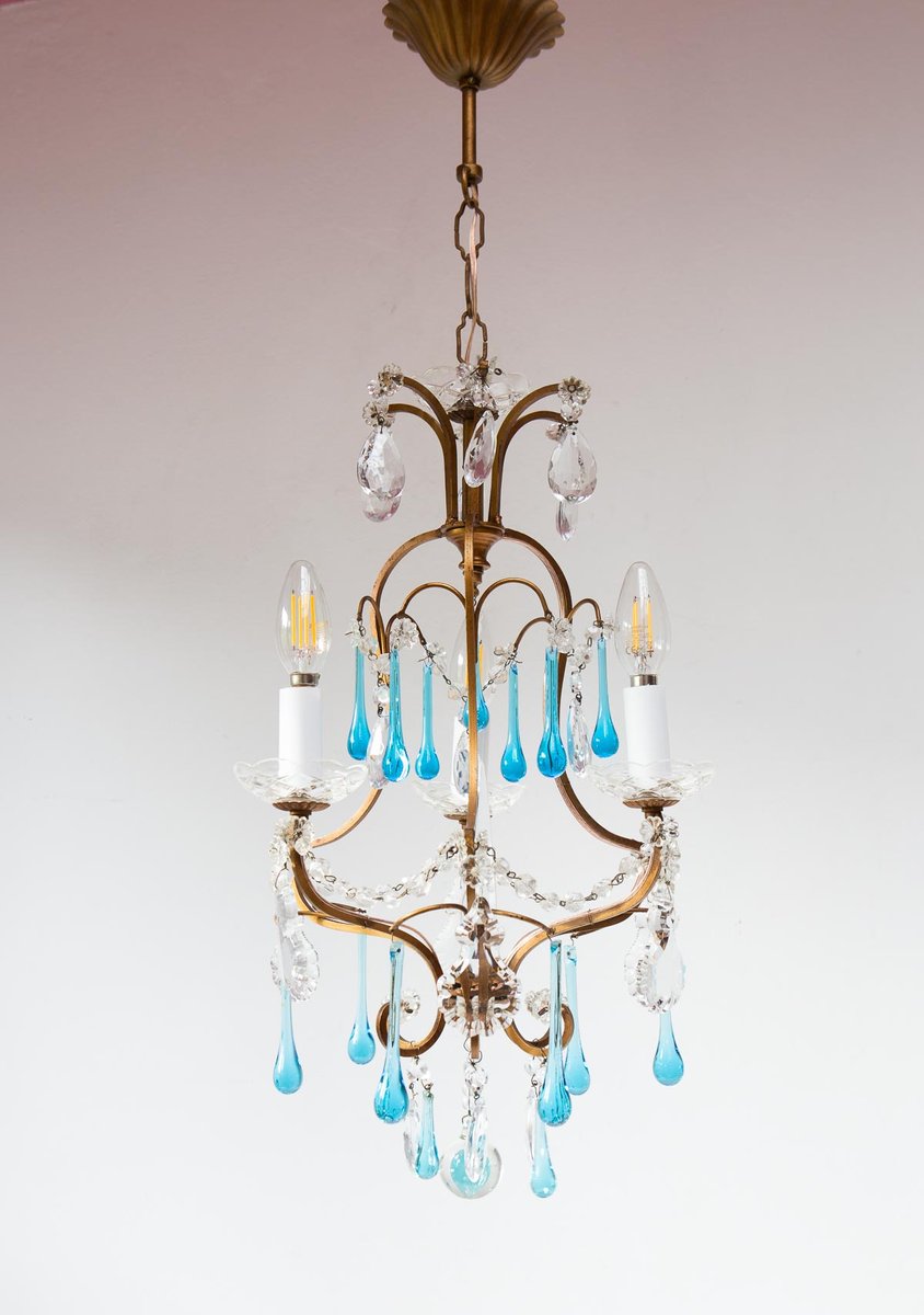 Vintage Italian Chandelier with Blue Glass Droplets, 1950s