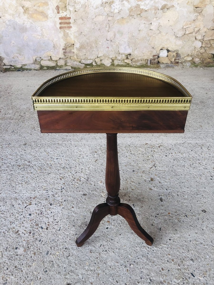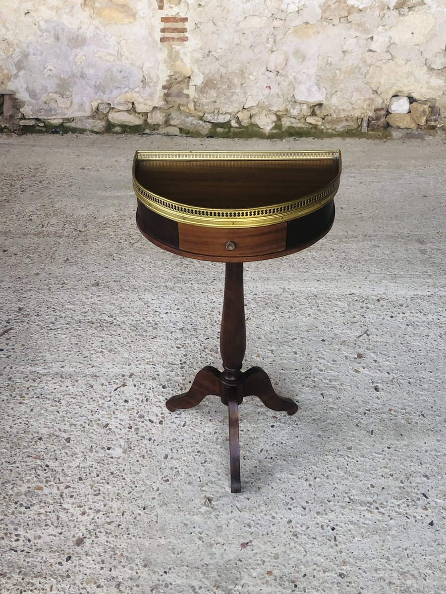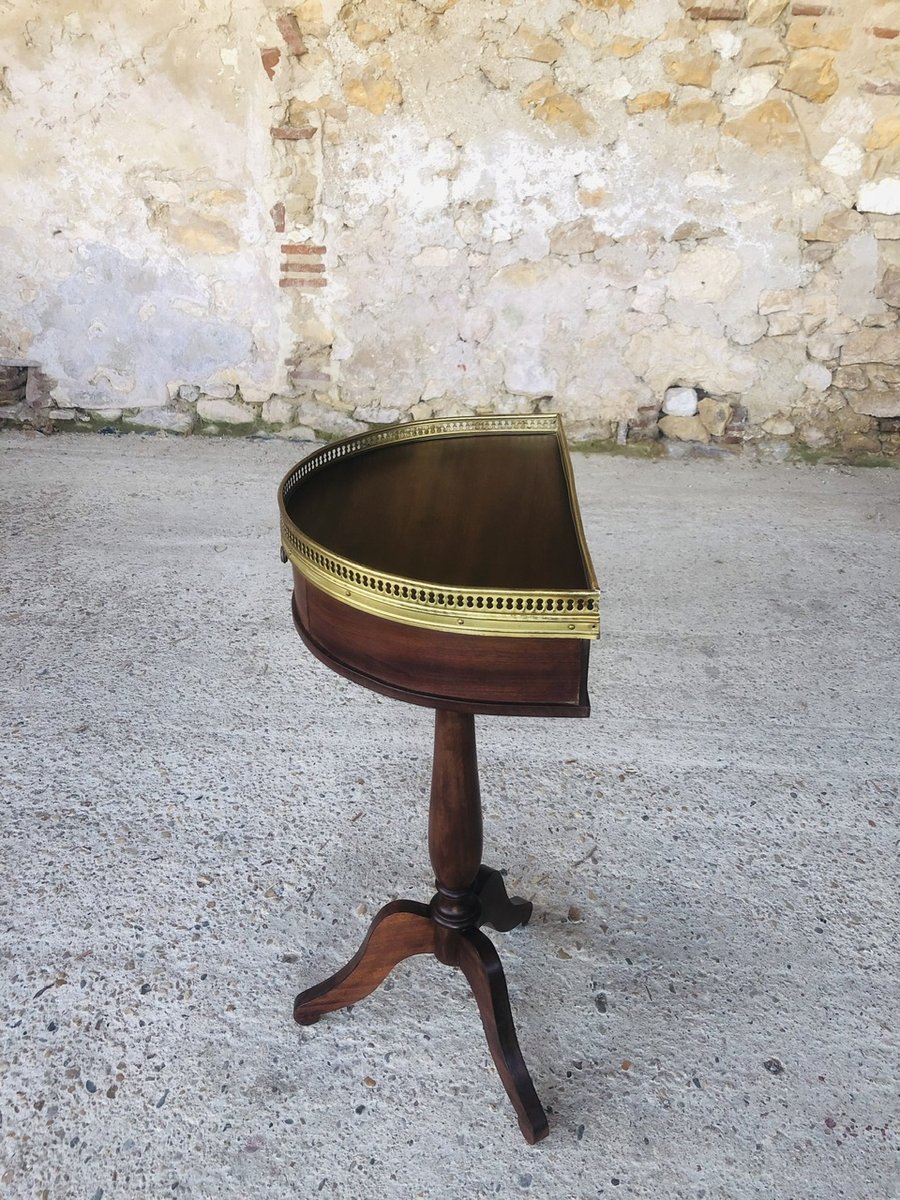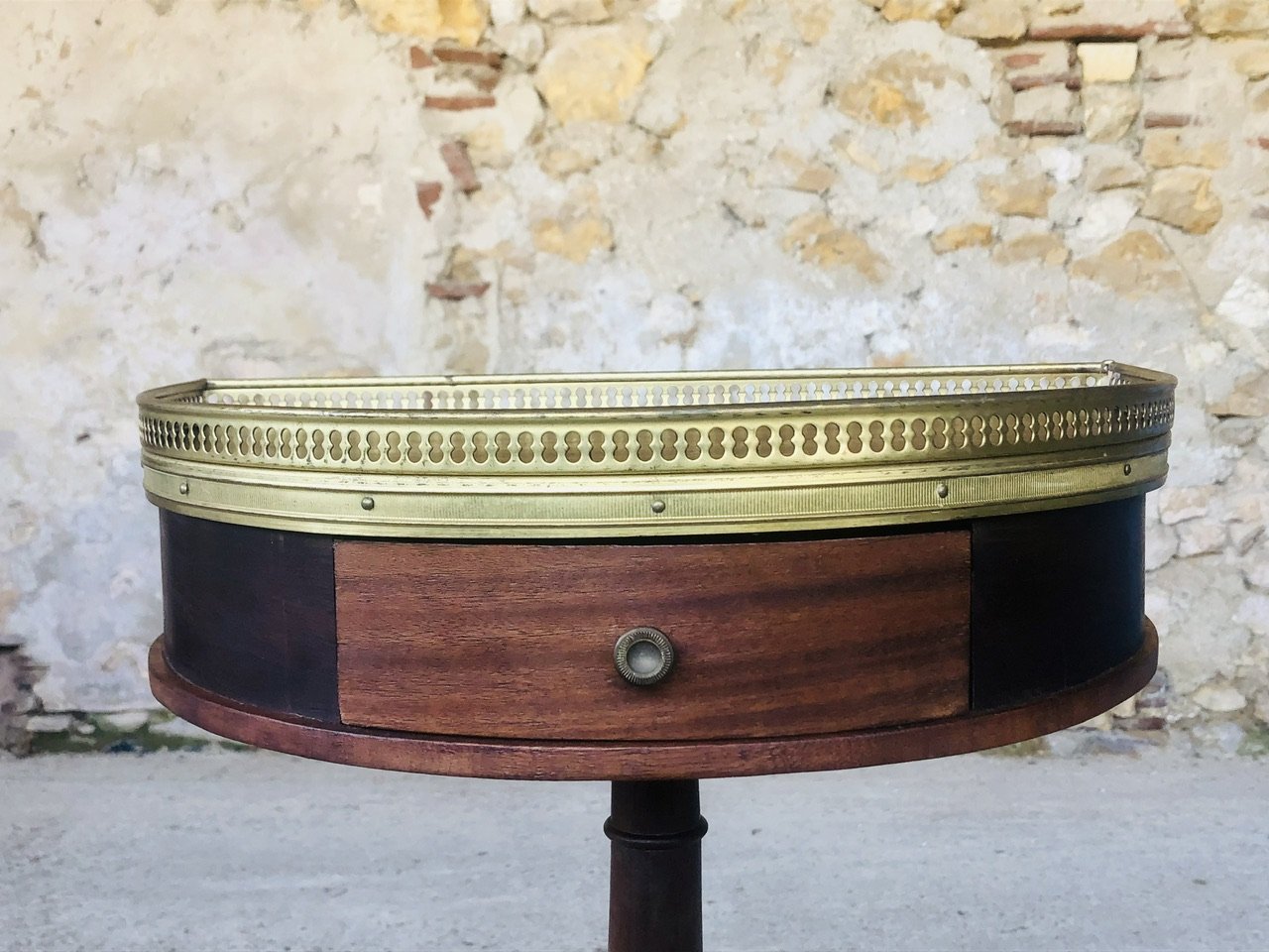 Piece is in in overall, very good, original and vintage condition with very light marks, signs of age and previous use commensurate with time, as well as a patina of time on the overall structure, top, brass gilding, edges, pull knob, pedestal and legs (see various photos). The front leg of the pedestal has slight discrepancy, but this does not affect the overall functionality of the piece (see photos.)