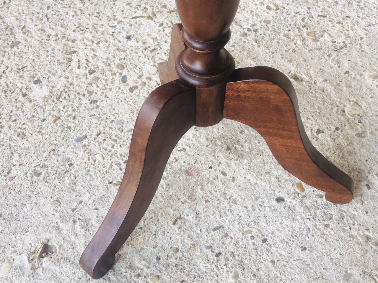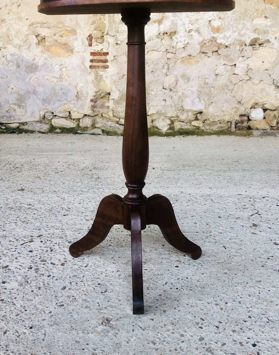 Piece is made of solid wood, with a striped, mahogany-veneered finish on the top, sides, drawer and back, and beautiful, brass, gilded decor around the edges of the top (see photos.) It has a lovely pedestal resting on elegant, yet simple, tripod legs, typical of the period. There is also a very nice contrast in color, between the top, sides drawer and back (see photos.)