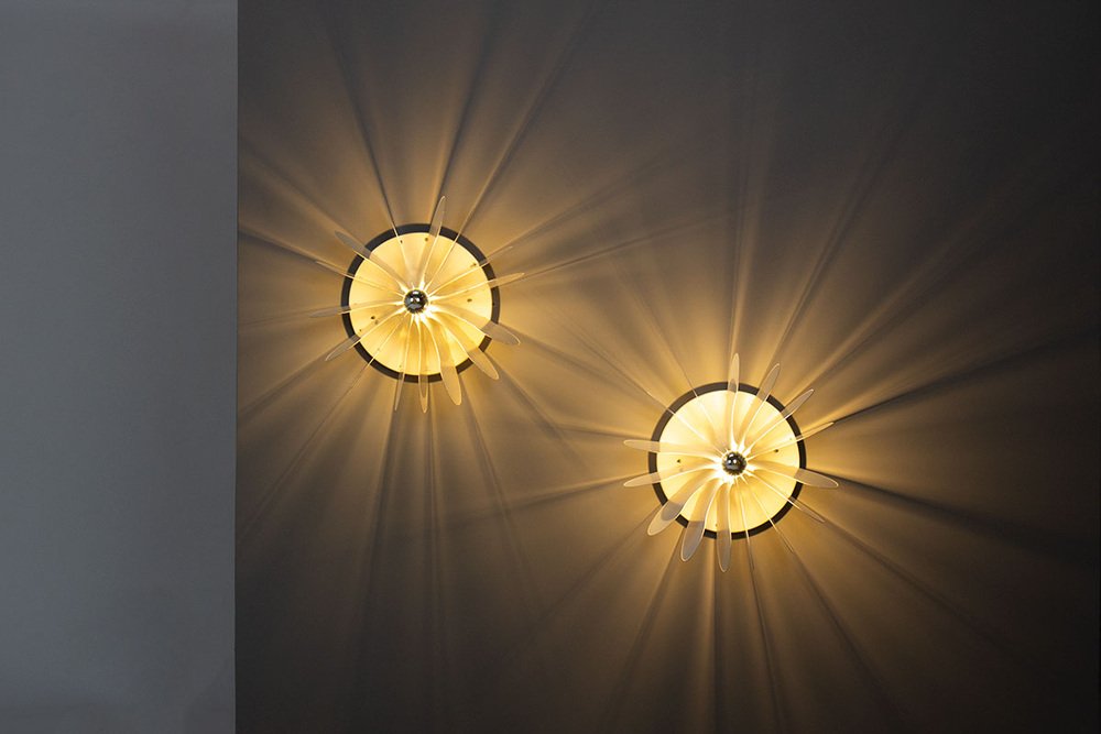 In the 1960s, Raak began collaborating with the well-known artist and glassmaker Willem van Oyen. While the marriage of art and industry was common in the Netherlands—where the lines between the creative professions were often blurred and many artists also worked as designers—the results of van Oyen's contributions Raak were far from ordinary. Raak promoted Van Oyen’s iconic, handcrafted Chartres Wall Lights (c.1964) as smeltschilderijen, or "melted paintings." The series was inspired by the magnificent stained glass windows of Chartres Cathedral in France.