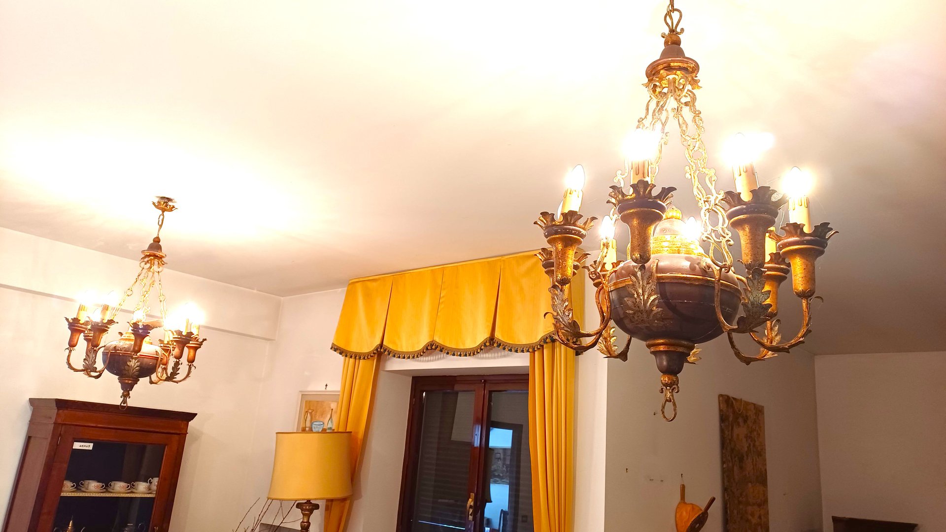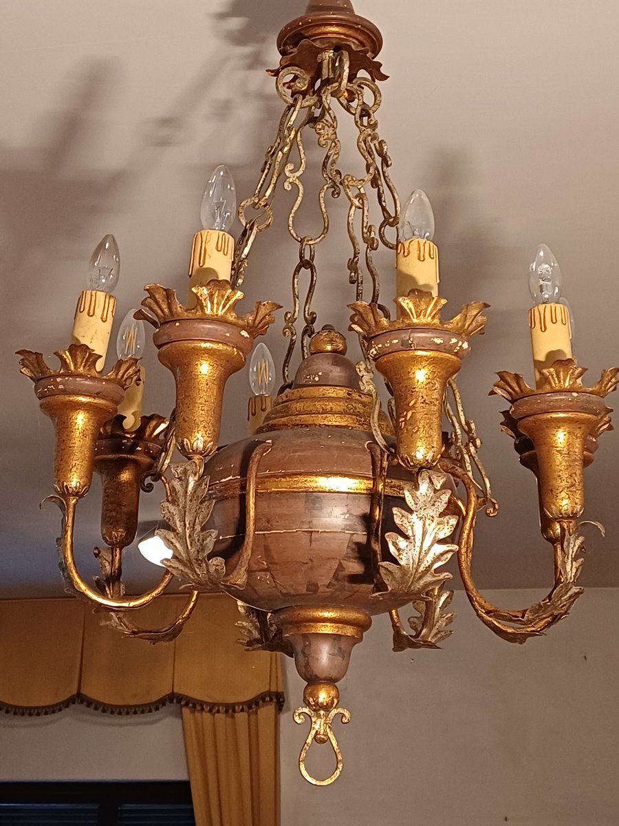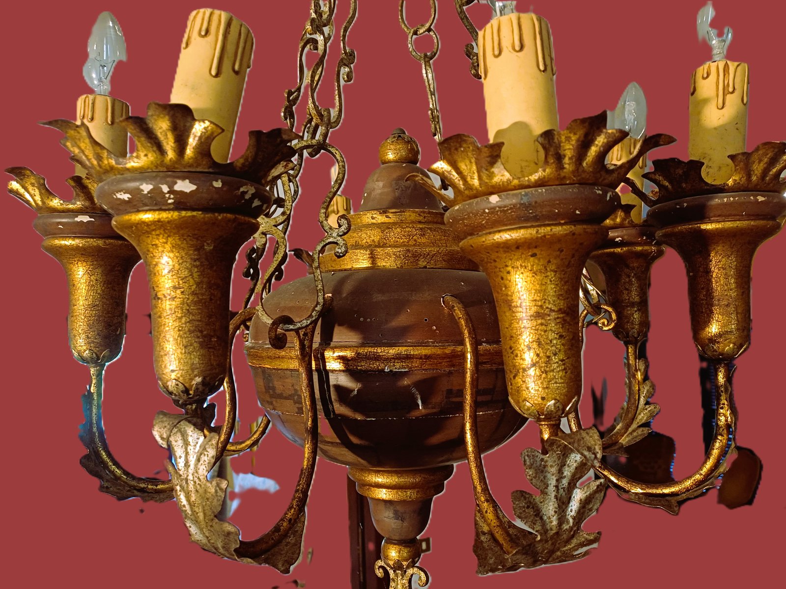 Wooden and Brass Six-Armed Chandeliers, 1920s, Set of 2