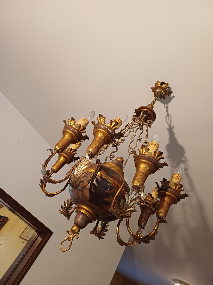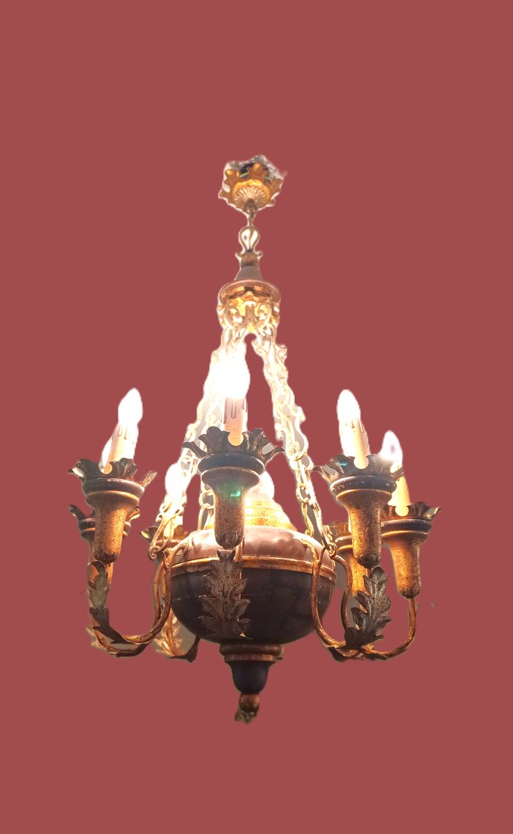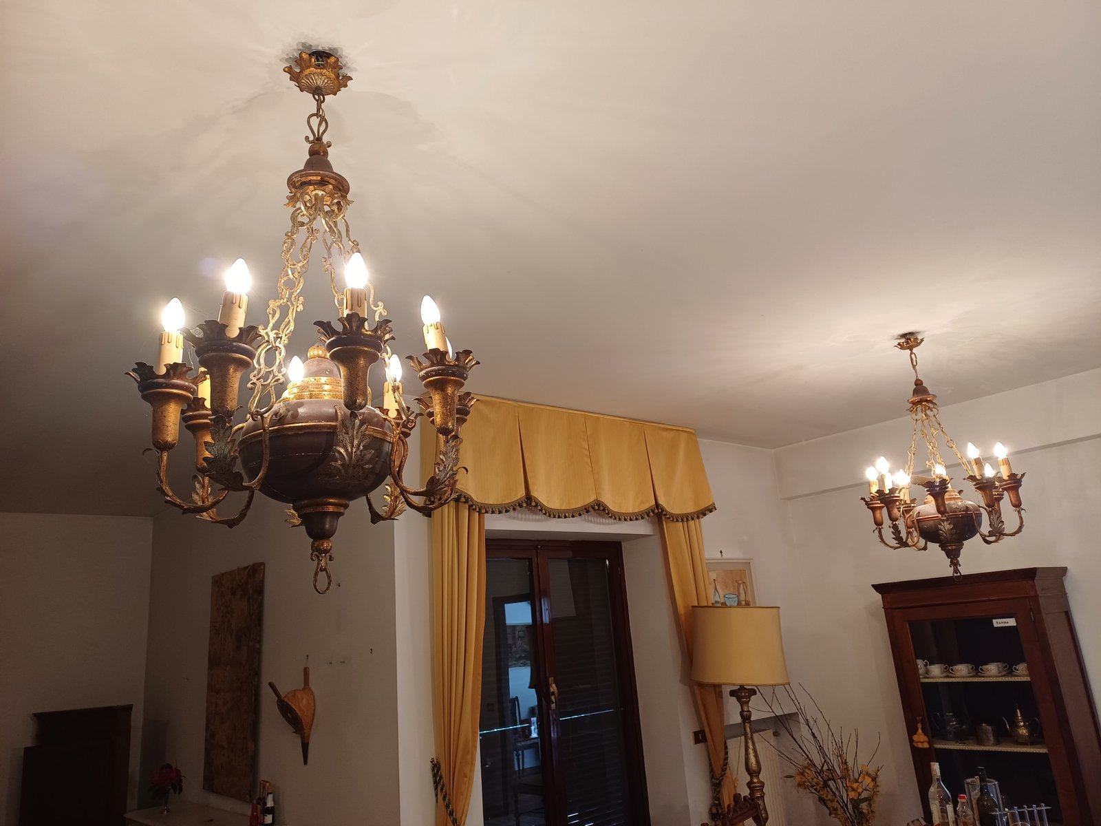 Wooden and Brass Six-Armed Chandeliers, 1920s, Set of 2