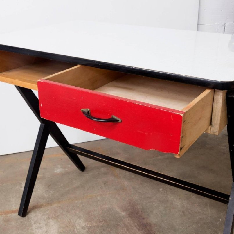 Dutch industrial designer Coen de Vries was born in The Hague in 1918. From 1940 until 1946, he studied interior design at the Royal Academy of Fine Arts in The Hague under Dutch designer Cor Alons (1892-1967). During this time, he also studied on exchange at the Institute of Applied Art (IvKNO) in Amsterdam under visionary architect Mart Stam (1899-1986) and functionalist architect-designer Johan Niegeman (1902-1977). After graduating in 1946, de Vries became a member of the Amsterdam group known as “De 8” from 1947 until 1949. Founded in 1927, De 8 was an architectural avant-garde association that consisted initially of rationalist architects who were educated in the spirit of the Amsterdam School, such as Benjamin Merkelbach (1901-1961), Charles Karsten (1904-1979), and Han Groenewegen (1888-1980).